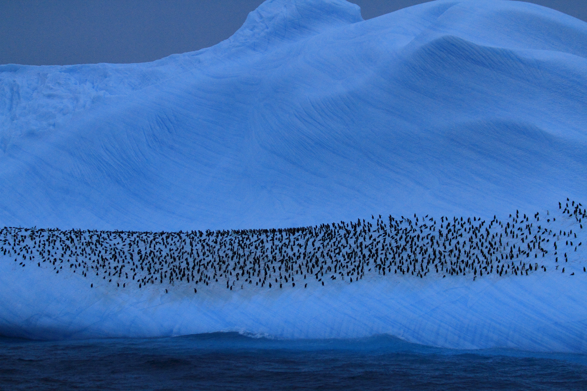"Feia una mitja hora que el sol s’havia post a la península Antàrtica i en la llunyania vàrem veure un enorme iceberg. A mida que ens anàvem acostant vàrem descobrir que hi havia una colònia enorme de Pingüins carablancs ( Pygoscelis antarcticus ) que utilitzaven aquest bloc de gel com a plataforma. Aquesta fotografia mostra un terç d'aquell iceberg on hi havia centenars de pingüins. Tot i que les condicions no eren les millors era impossible no intentar captar-ho amb la càmera. Va ser tot un repte perquè el vaixell no s'aturava i no hi havia llum."