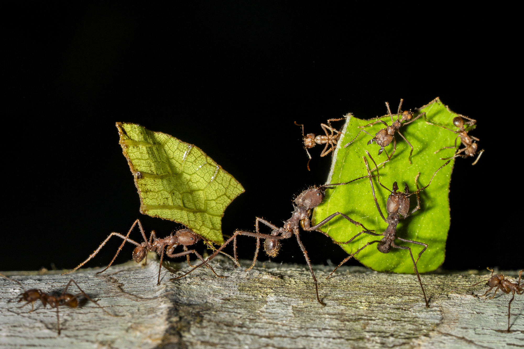 "Les formigues talladores de fulles destaquen pel seu sorprenent treball en equip. Aquests eficients insectes col·laboren en la recol·lecció de fulles, les transporten cap als seus formiguers i les utilitzen per cultivar els fongs dels que s’alimenten. Cada formiga exerceix un paper específic, des de talladores fins a soldats que protegeixen el formiguer, demostrant una organització social impressionant en la seva tasca diària. Aquest extraordinari exemple de cooperació dels insectes eusocials resulta clau per assegurar l'èxit de la colònia."