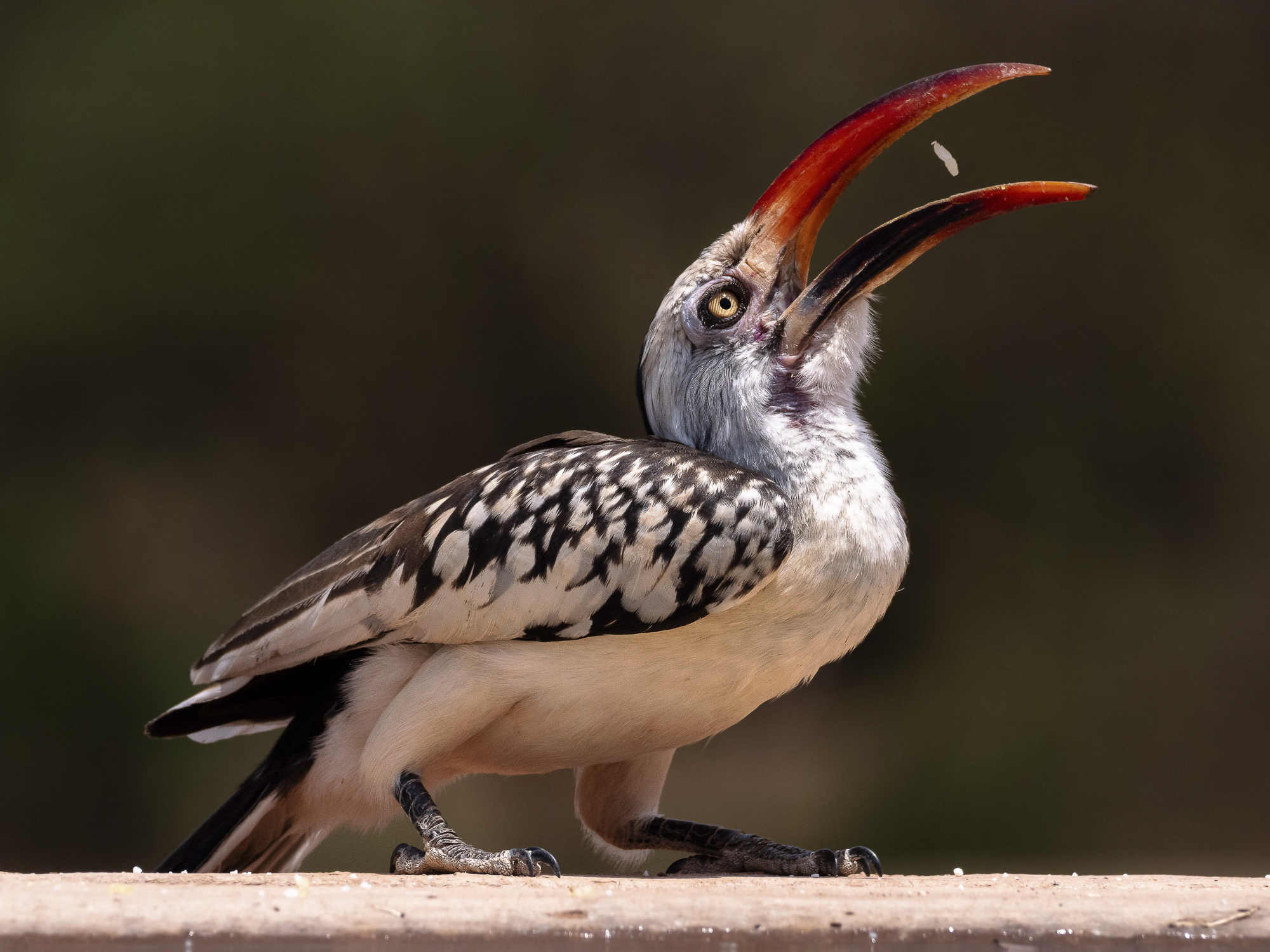 "El bec del calau pot no semblar adient per menjar grans del terra. Ho soluciona llençant gra per gra a l'aire i atrapant-los en caure. Amb paciència, reflexos i sort vaig poder captar el moment exacte en que menja un gra d'arròs."