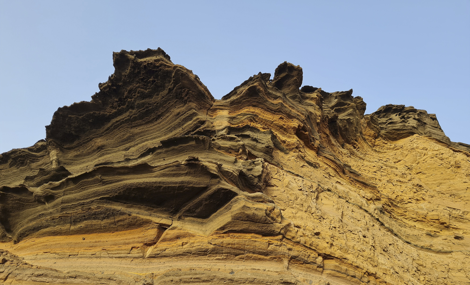 "Foto realitzada a Lanzarote, Illes Canàries. Entre els més de 100 volcans, mentre buscava la millor posta de sol de tot l’arxipèlag, vaig trobar la localitat d’El Golfo, on també es troba l’impressionant ‘Charco de los Clicos’, el cràter del volcà. La fotografia mostra l’elevació d’una part d’aquest, que va tenir la seva última erupció al segle XVIII. Per la seva localització al costat del mar, aquest ha provocat l’erosió de mitja muntanya. Tot i això, em va impressionar la magnitud de la roca, així com la seva forma orgànica, els seus colors potenciats per la llum del capvespre i les capes que es poden distingir i comptar una a una."