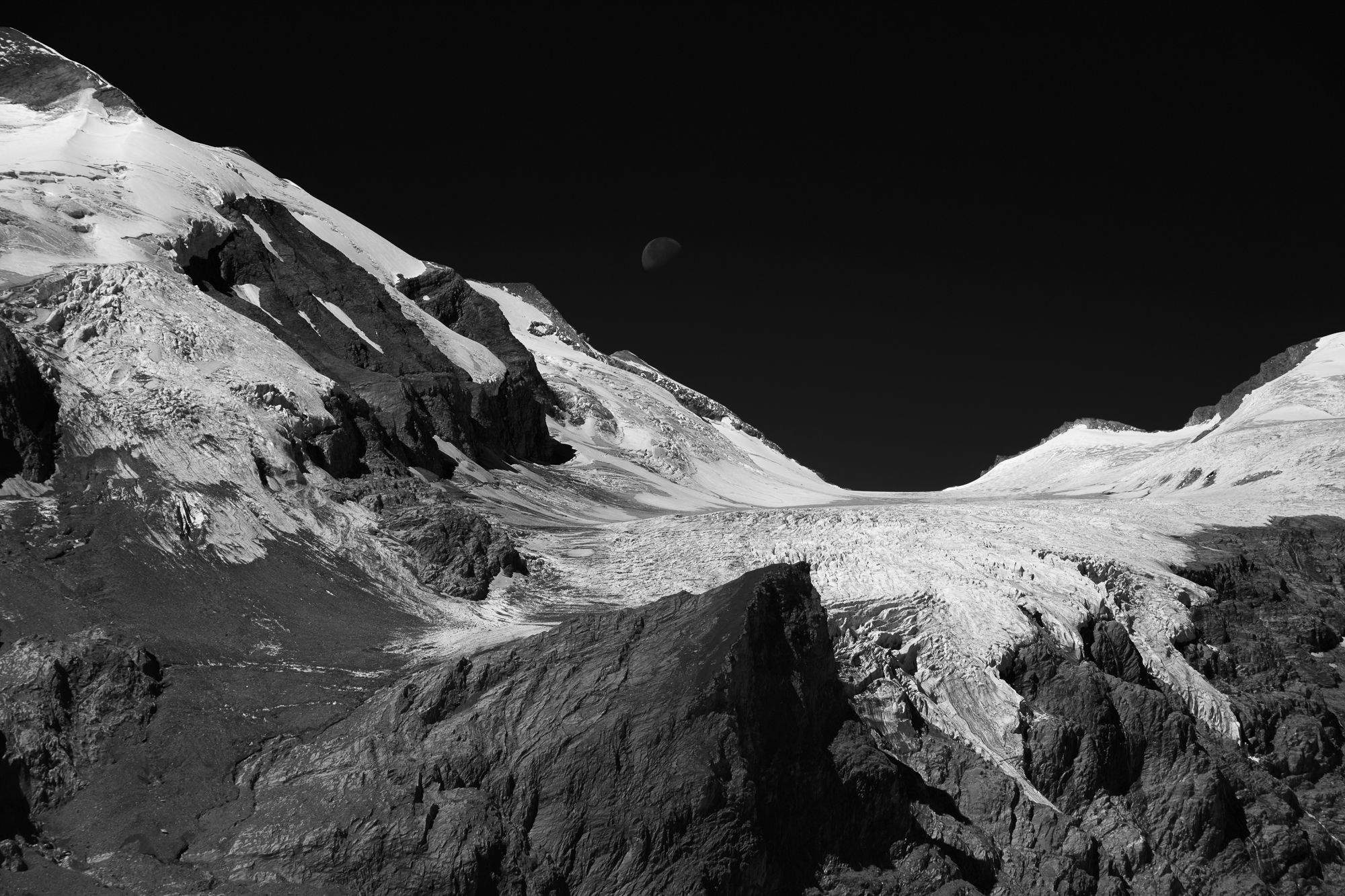 "El Grossglockner és la muntanya més alta d’Àustria, i tota la zona que l’envolta té un relleu espectacular. Si no era suficient amb això, a més a més hi ha una glacera, en regressió, que allarga la seva morrena fins un llac que queda a la part no visible a sota de la foto. Quan hi vàrem arribar vaig veure que encara no s’havia post la Lluna darrere les crestes i vaig creure que seria bona idea sacrificar part de la glacera i el pic del Grossglockner per aconseguir que es veiés la Lluna sobre una de les llengües de la glacera, un paisatge, que si no fos pel gel, semblaria d’un altre planeta."
