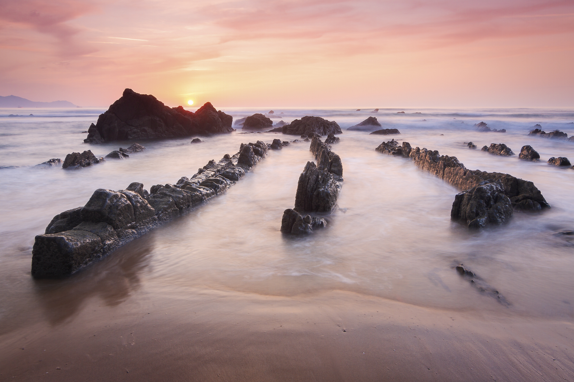 "La posta de sol escalfa la pell de roca dels dracs de la platja de Barrika."