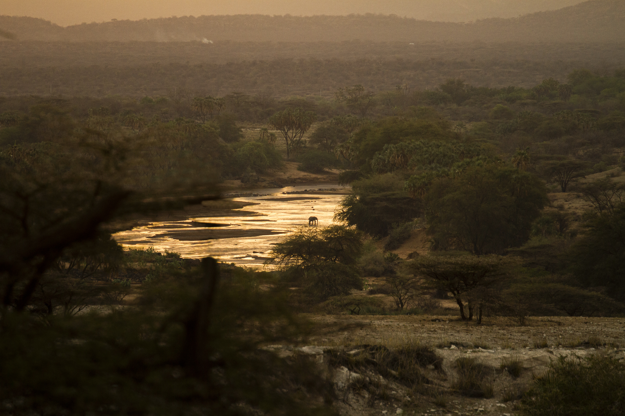 "Una tarda qualsevol, mentre es pon el sol a la Reserva Natural de Samburu, al centre de Kenya, té lloc aquest espectacle de llum que converteix en daurat el riu Ewaso Ng'iro, que en l'idioma de la regió, una variant del Maasai anomenada Samburu, significa 'riu d'aigua marró o fangosa'. En aquell precís instant un elefant africà de la sabana (Loxodonta africana) se separa de la seva família per beure una mica d'aigua i em regala aquesta poètica imatge."
