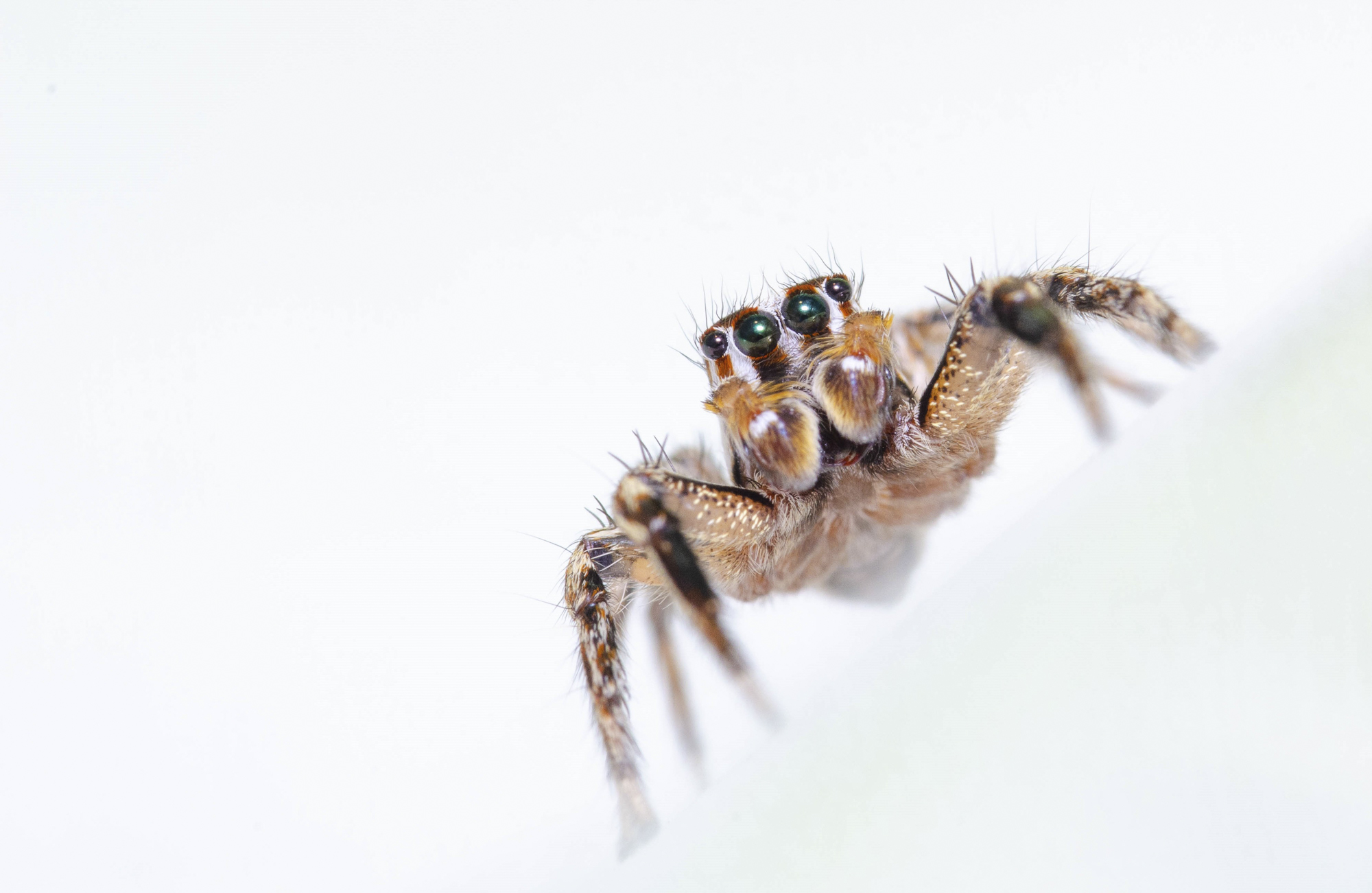 "A diferència de la majoria d'aranyes, les aranyes saltadores tenen molt bona vista gràcies als seus dos grans ulls frontals, a part de sis de més petits. Mentre fotografiava aquest saltícid sobre una safata blanca, en fer un moviment em va detectar i es va girar mirant-me fixament. Vaig aprofitar el moment i vaig disparar diverses fotografies. De fet, als seus ulls s'hi pot veure reflectit el flaix de la càmera."