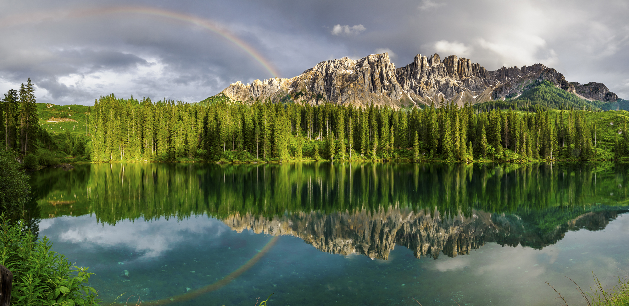 "Vàrem arribar al llac de Carezza (Dolomites) i de seguida ens van meravellar els reflexes que hi havien. Una lleugera boira anava i venia, tapant i destapant els arbres. Després de caure quatre gotes va sortir el sol, i la natura ens va meravellar amb un arc de Sant Martí que es reflectia a l'aigua. Per poder capturar tota la bellesa del moment vaig fer una panoràmica de vuit fotos en vertical."