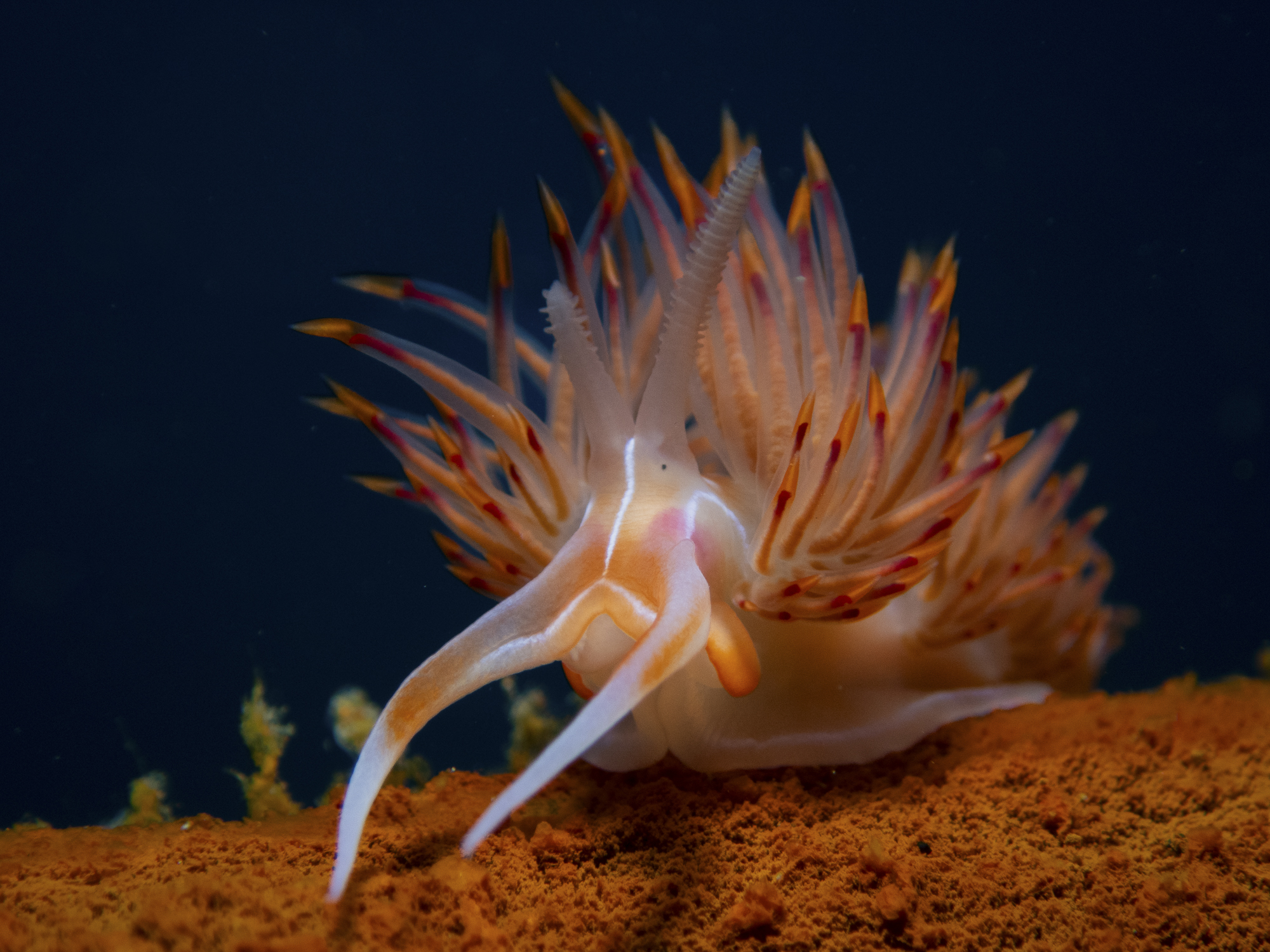 "Aquesta imatge captura l'elegància i la coloració d'un nudibranqui enmig d'un oceà infinit. Amb les seves formes vermelloses i taronges, aquest organisme sembla una flama viva que crema dins les aigües. El nom de l'espècie es Nemensignis banyulensis, i en aquesta imatge pareix que un rinòfor estigui partit. El curiós del lloc és el contrast de colors amb el vaixell que reposa en aquest fons, la Dragonera, un lloc únic per observar nudibranquis."