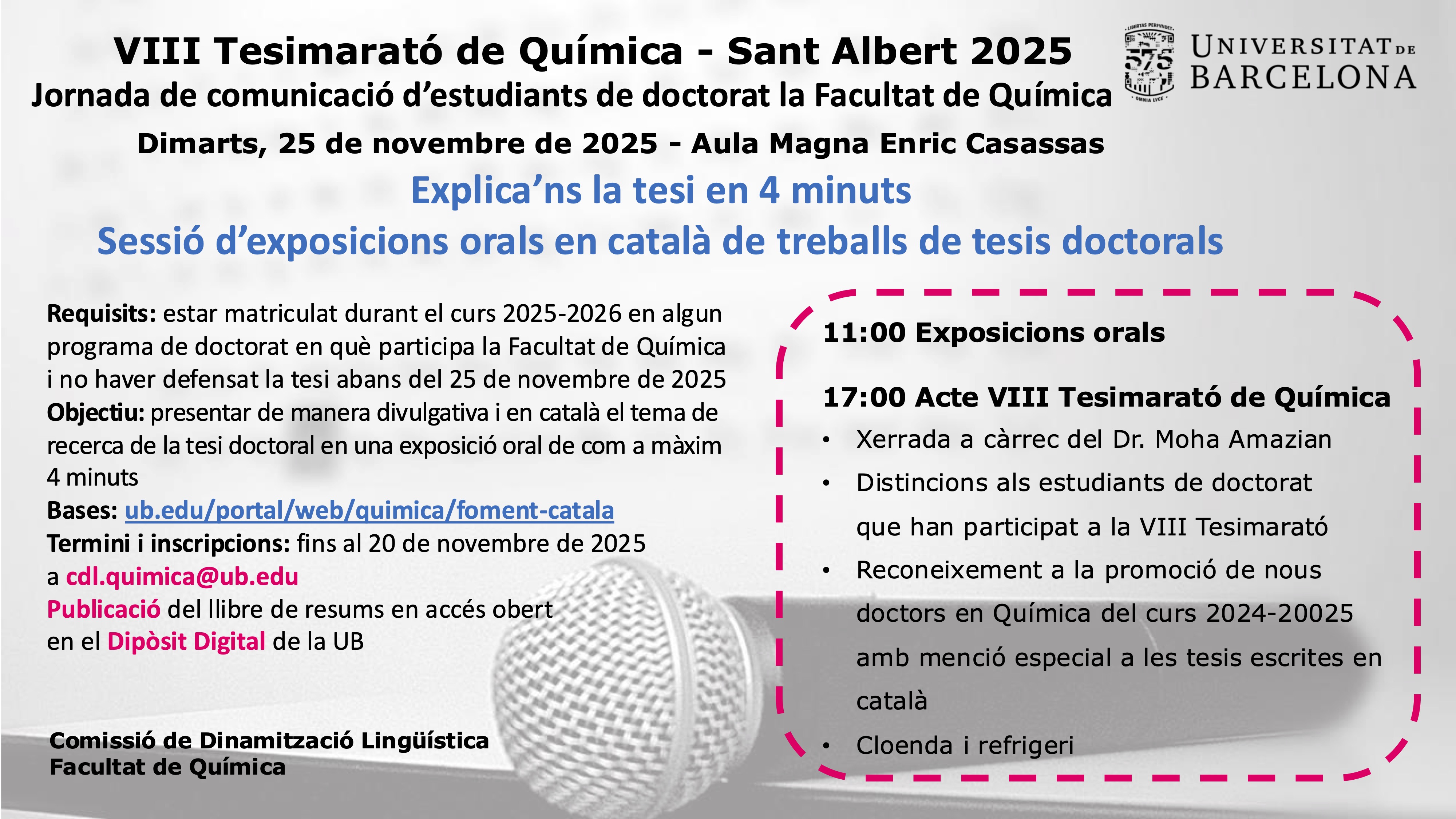 La Comissió de Dinamització Lingüística de la Facultat de Química ha començat ja a anunciar la vuitena edició de la Tesimarató de Química, que organitza en el marc de la festivitat de Sant Albert com una jornada de comunicació de joves investigadors. Aquest acte consisteix en una successió d’intervencions orals, en català i molt breus, en què els doctorands de la Facultat exposen en 4 minuts el tema i els objectius del seu treball de tesi doctoral.