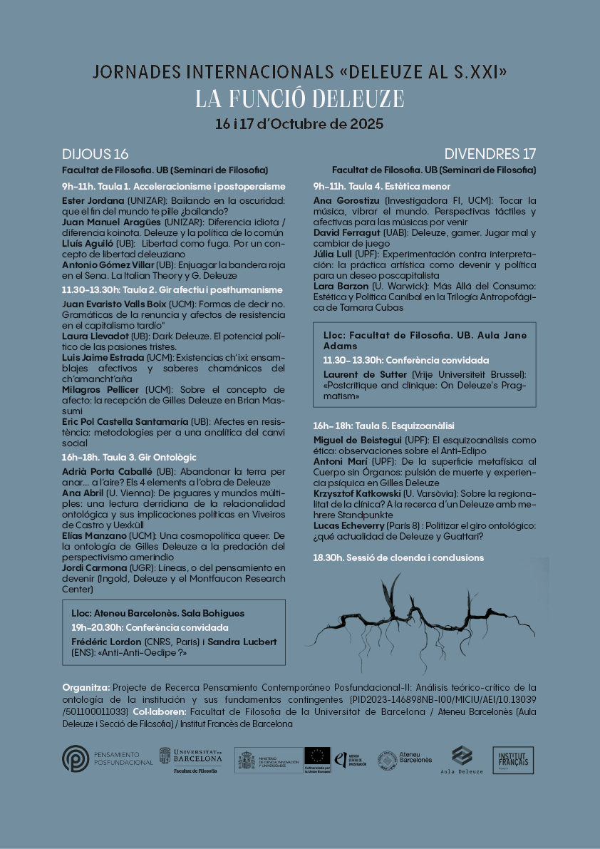 Els dies 16 i 17 d’octubre de 2025 tindran lloc les Jornades Internacionals «Deleuze al s. XXI», un esdeveniment acadèmic dedicat a explorar la vigència del pensament de Gilles Deleuze en el context contemporani. Les jornades es dividiran en dues sessions: