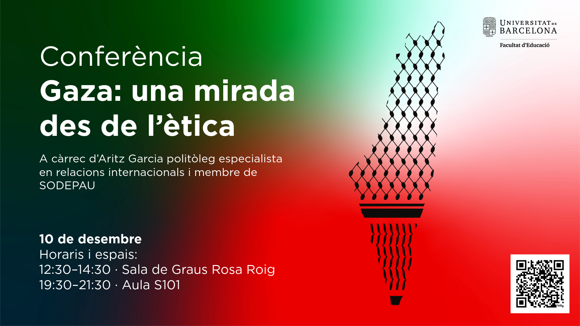 Xerrada a càrrec d’Aritz Garcia, politòleg especialista en relacions internacionals i membre de SODEPAU, que proposa una reflexió ètica sobre la situació a Gaza. Activitat organitzada per l’assignatura «Ètica, Valors i Educació Social».