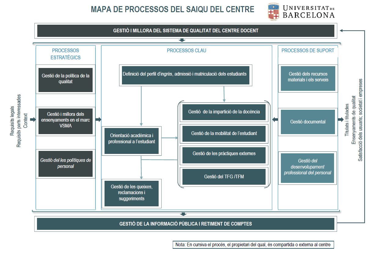 El mapa de processos recull tots els processos que gestiona el SAIQU de la facultat de Farmàcia i Ciències de l’Alimentació lligats als programes formatius. S'han classificat en processos estratègics, clau i de suport.