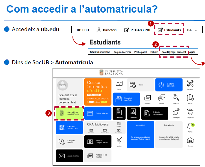 Si teniu dubtes sobre si voleu cursar o no una assignatura, recordeu que l’automatrícula (18 i 19 de setembre) i a la modificació de matrícula (25 i 26 de setembre) es poden fer canvis (afegir assignatures, anul·lar-les i/o modificar la vostra matrícula) dins dels set dies següents a la seva formalització.