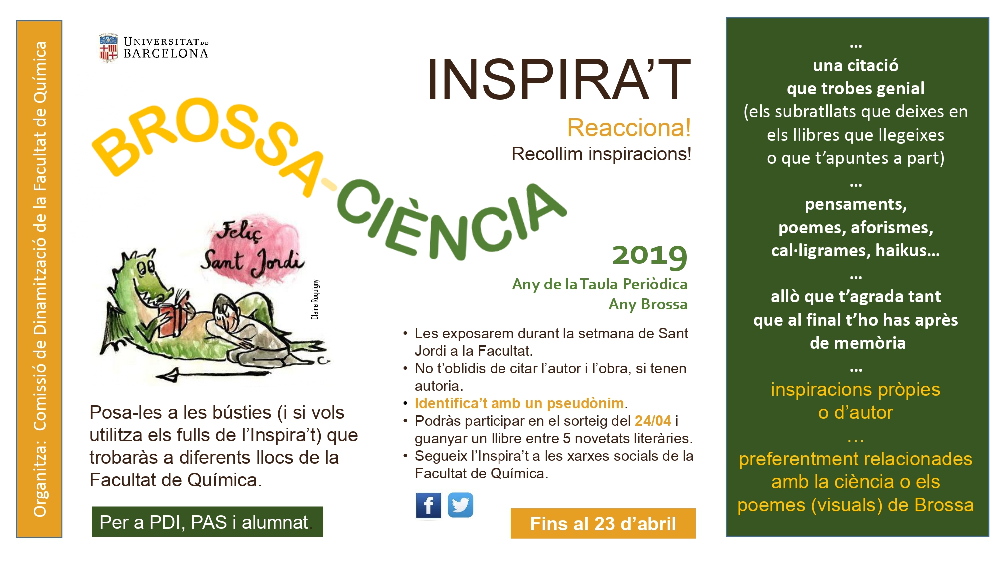 Anteriorment, per Sant Jordi se celebraven les següents activitats: 1) Quatre paraules de Química. Activitat col·laborativa adreçada al PAS, PDI i alumnat per celebrar la diada de Sant Jordi. Es basa a respondre a preguntes formulades a través d’una aplicació digital. Amb les paraules de les respostes, l’app crea núvols de paraules la mida de les quals està en funció del nombre de respostes de les persones participants. Sorgida el 2022, aquesta iniciativa –que es pot consultar a l’Agenda de la web principal: i 2) Inspira’t, que tractava de recollir inspiracions de l’audiència sobre temes diversos. Es pot consultar el Cartell de l'edició de 2019 i la butlleta de participació.