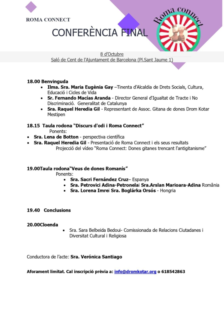 El dimarts 8 d’octubre de 2024, el Saló de Cent de l’Ajuntament de Barcelona serà l’escenari de la conferència final del projecte europeu ROMA CONNECT, organitzada per l’Associació Gitana de Dones Drom Kotar Mestipen. L’esdeveniment està obert al públic general i representa una excel·lent oportunitat per a estudiants i professionals de la Sociologia i altres disciplines de les Ciències Socials. Inscripcions: https://t.co/0CNgbKQPsb