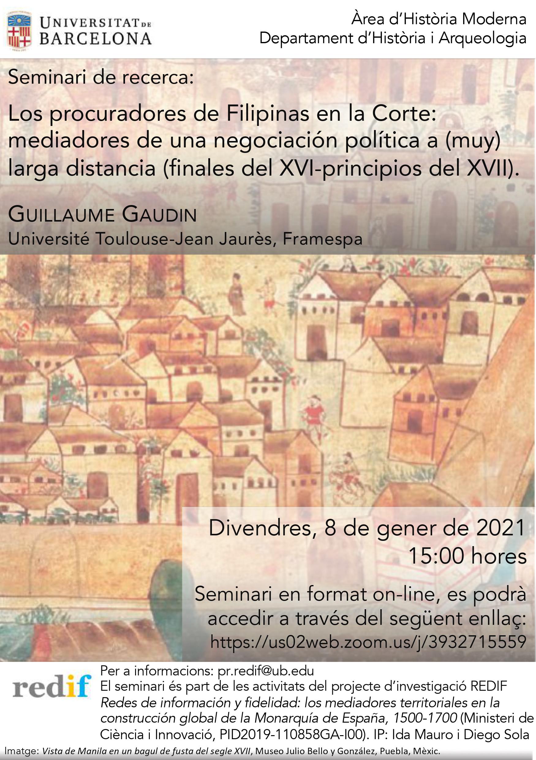 Aquest divendres, 8 de gener de 2021, durem a terme el primer seminari d'investigació obert del projecte REDIF. El professor i investigador Guillaume Gaudin (Université Toulouse-Jean Jaurès) intervindrà sota el títol "Els procuradors de Filipines a la Cort: mediadors d'una negociació política a (molt) llarga distància (finals del s. XVI-principis del s.XVII)". L'activitat serà virtual (vegeu programa).