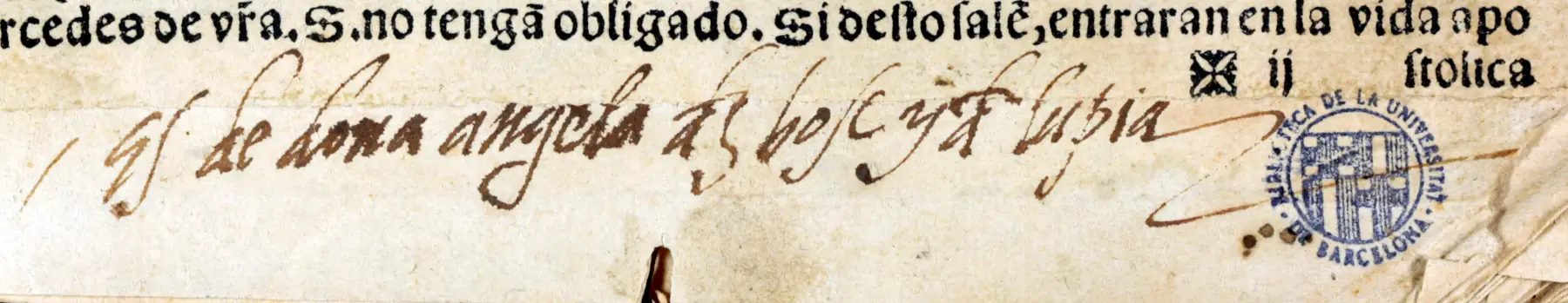 Exlibris manuscrit al full [ ]2: "Es de dona Angela Desbosc y de Lupia"