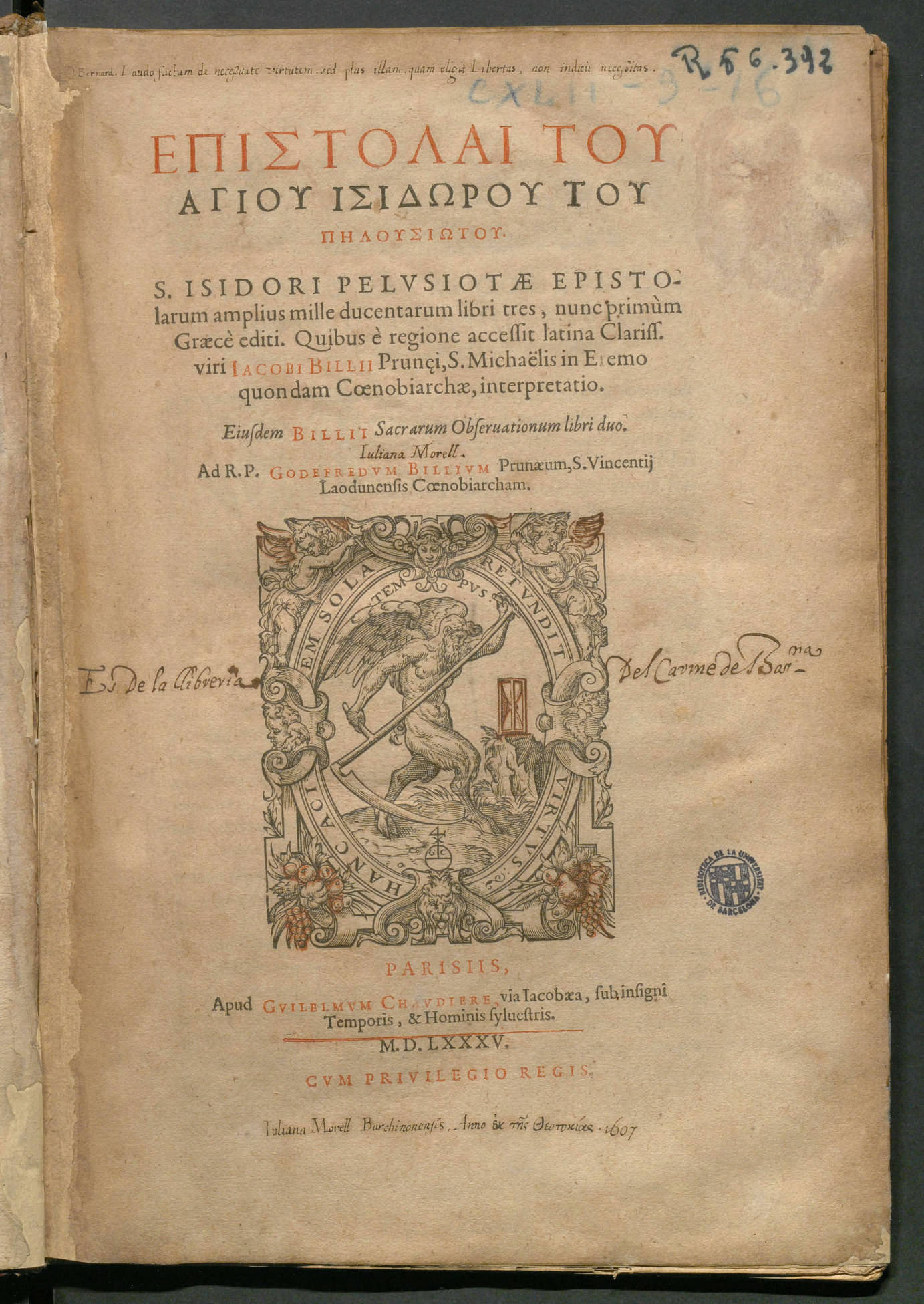 Isidor, de Pelusium, sant, actiu segle V. [Epistolai tou hagiou Isidorou tou Pelousiotou] = S.Isidori Pelusiotae Epistolarum amplius mille ducentarum libri tres ... París: Guillaume Chaudière, 1585. (B-46/3/14).