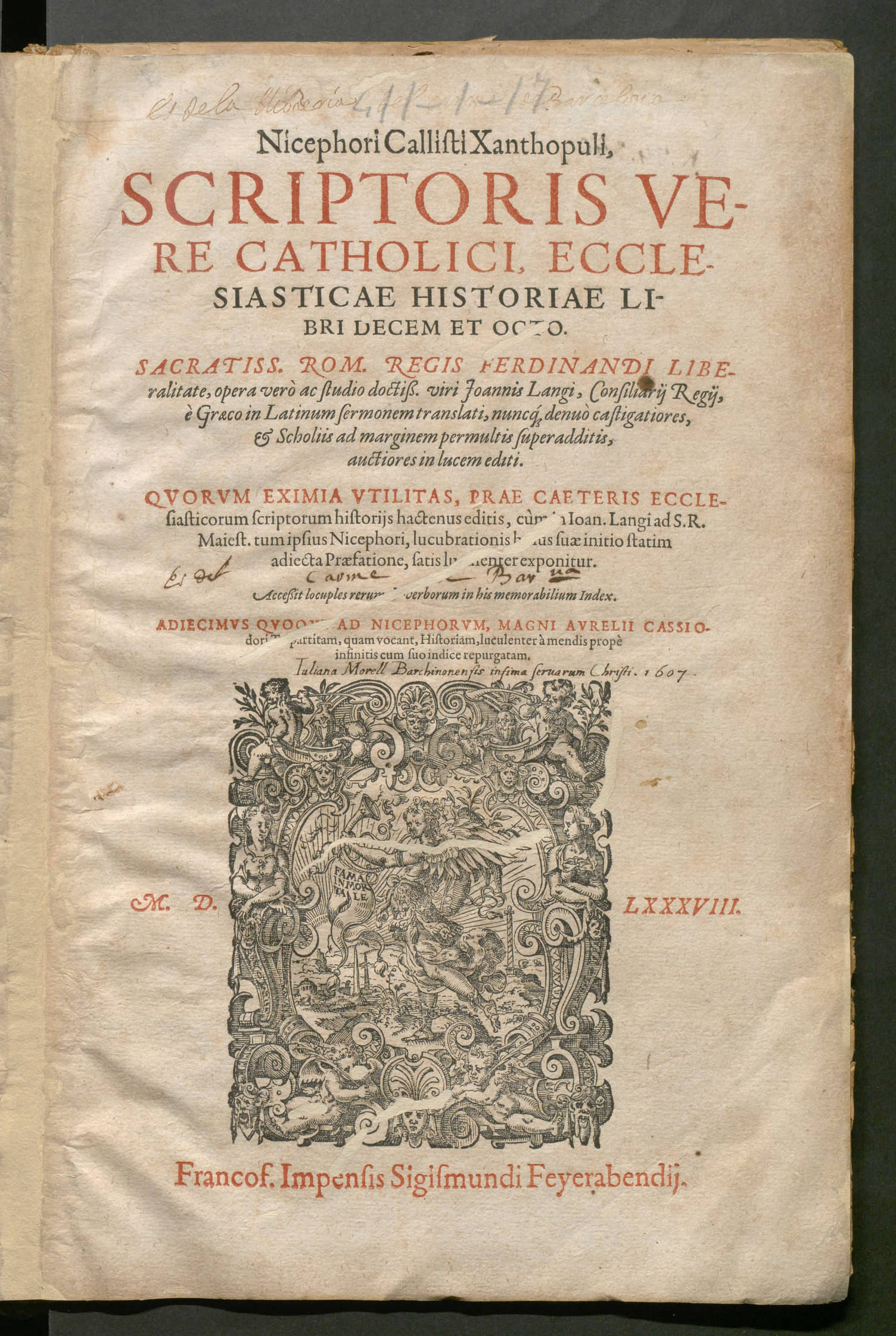 Nicephorus Callistus Xanthopulus, 1256?-1335? Ecclesiasticae historiae libri decem et octo... Frankfurt: Sigmund Feyerabend, 1588. (B-51/1/3).