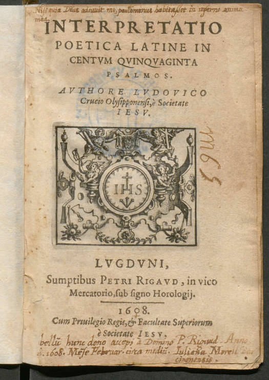Cruz, Luís da, 1543-1604. Interpretatio poetica Latine in centum quinquaginta psalmos Lió: Pierre Rigaud, 1608. (M-11875).