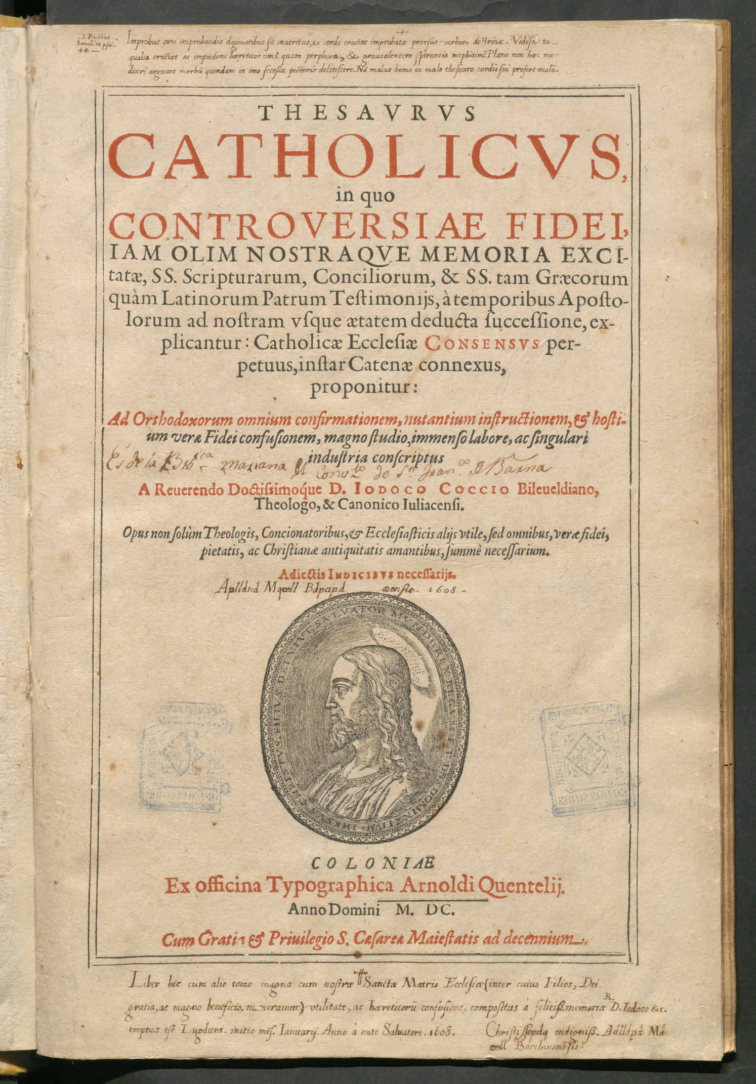 Coccius, Jodocus, -1619. Thesaurus Catholicus... Colònia: Arnold Quentel, 1600-1601. (M-9528).