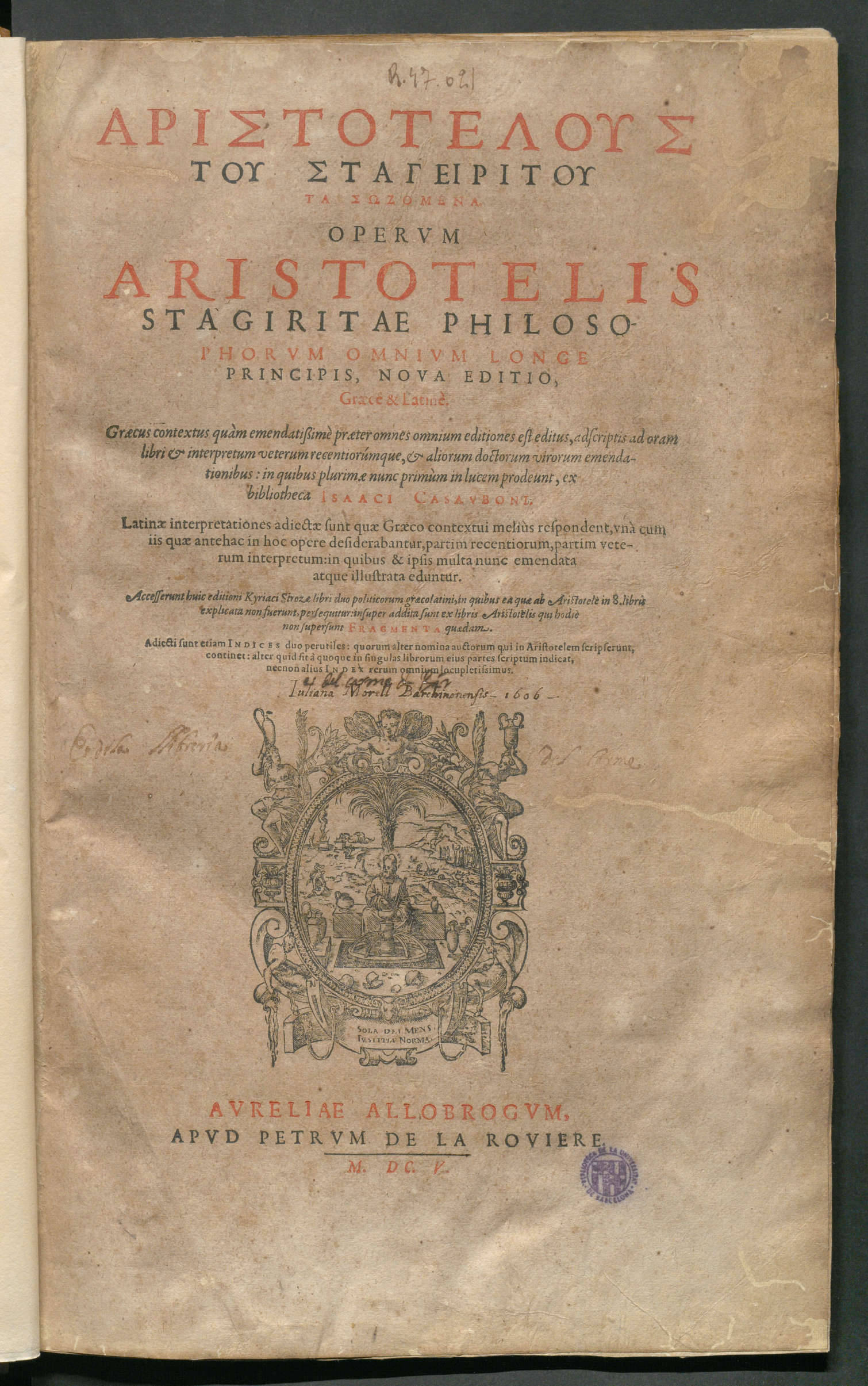 Aristòtil, 384 aC-322 aC. [Aristotelous ... Ta sozomena] = Operum Aristotelis noua editio Ginebra: Pierre de la Rovière, 1605. V. 1. (XVII-9246).