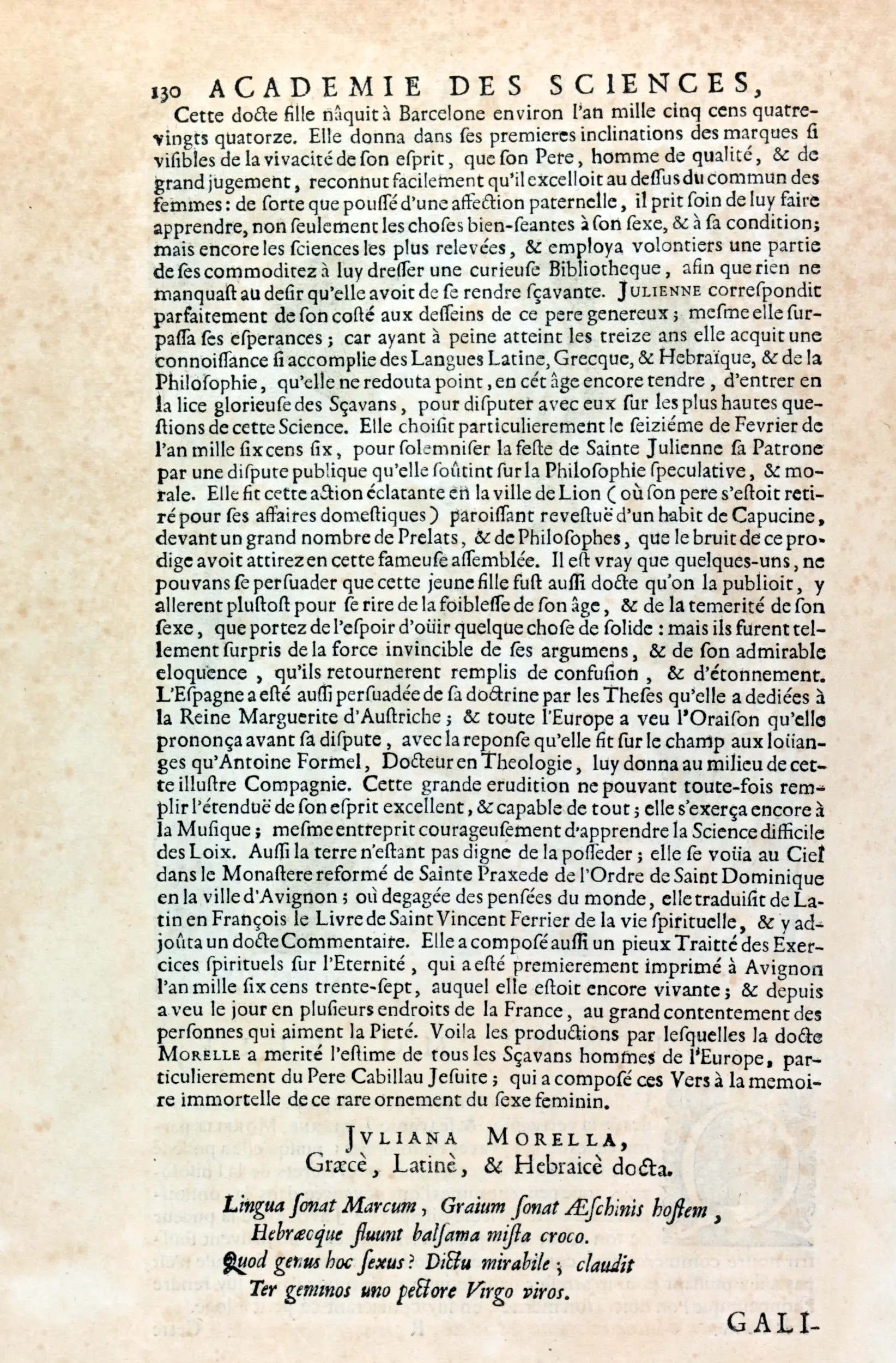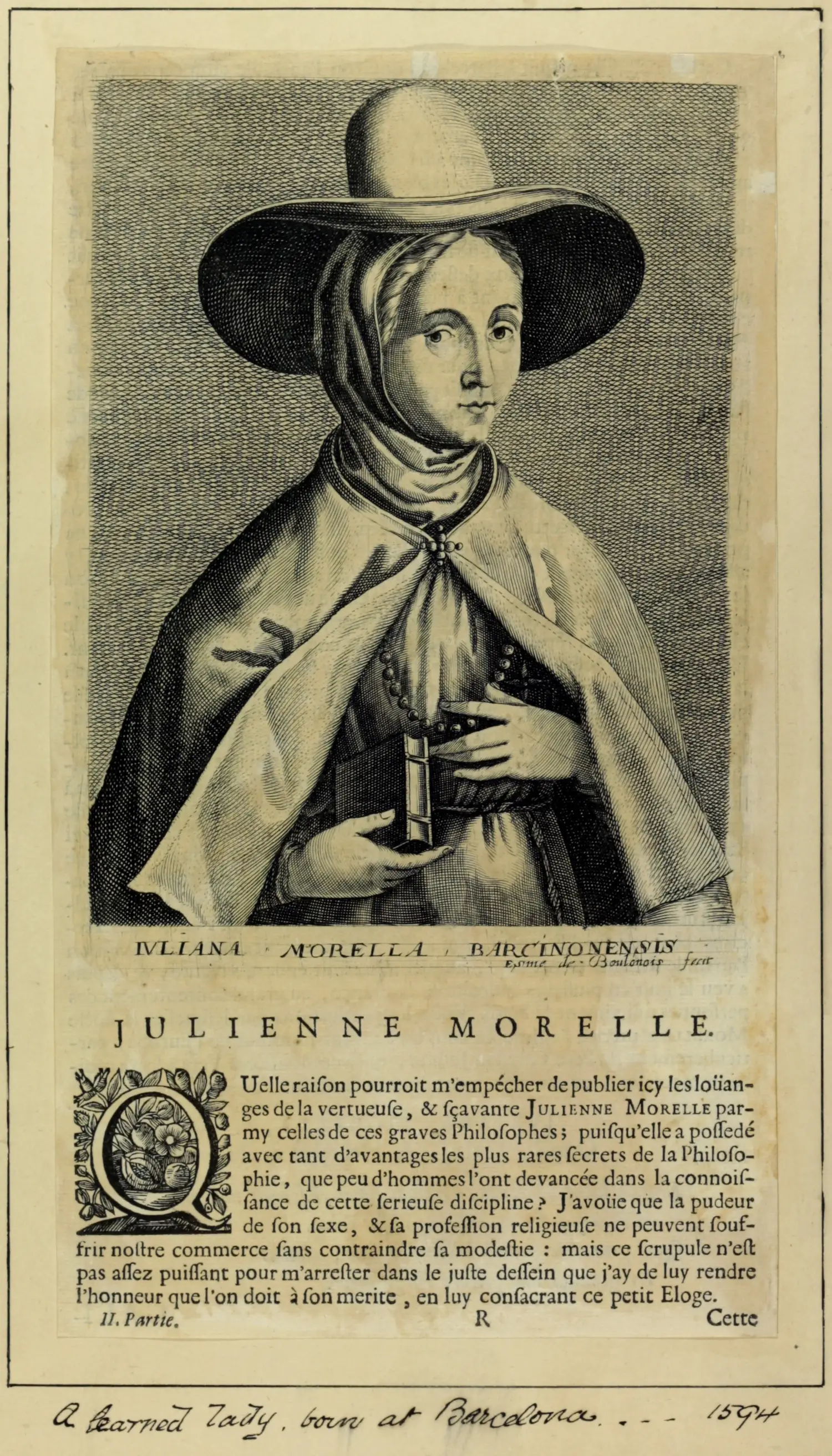 Retrat de Juliana Morell, gravat per Edme de Boulonois. Dins: Bullart, Isaac, 1599-1672. Académie des sciences et des arts, contenant les vies & les éloges historiques des hommes illustres, qui ont excellé en ces professions depuis environ quatre siècles parmy diverses nations de l’Europe... Amsterdam: les soins de l’autheur, 1682. V. 2, p. 129-130.