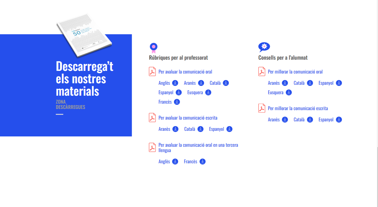 Per acabar, convé destacar que tant els consells pràctics per a l’alumnat com les rúbriques d’avaluació per al professorat es poden consultar en diverses llengües, la majoria en català, castellà i anglès, però algunes també en aranès, basc i francès. Tots els documents es poden descarregar gratuïtament en format PDF.