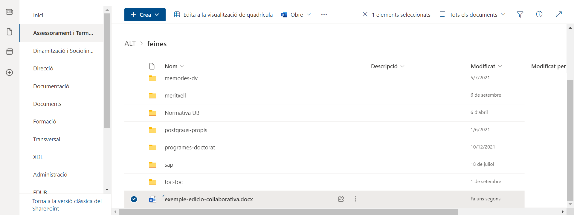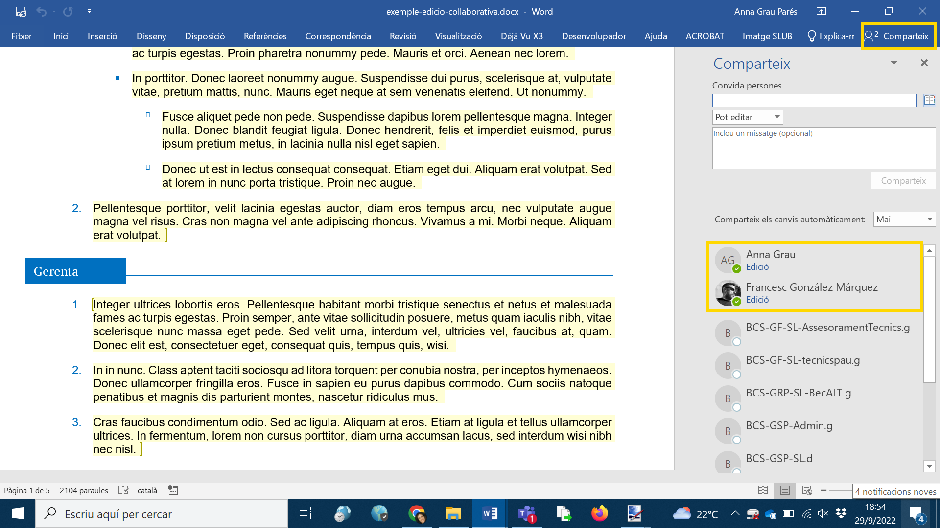 Quan accediu al fitxer des del navegador, el SharePoint o el Teams, opteu per obrir el document a l’aplicació d’escriptori (de fet, si el text té seccions d’escriptura restringida, per exemple, no tindreu cap altra alternativa). Si hi ha algú més editant el document, ho veureu. Un cop hàgiu fet les vostres esmenes, en desar el document, si detecta fragments amb canvis de persones diferents, us avisarà del conflicte i us demanarà que el resolgueu. Un cop resolts els possibles canvis conflictius, podreu desar el document sense problema.