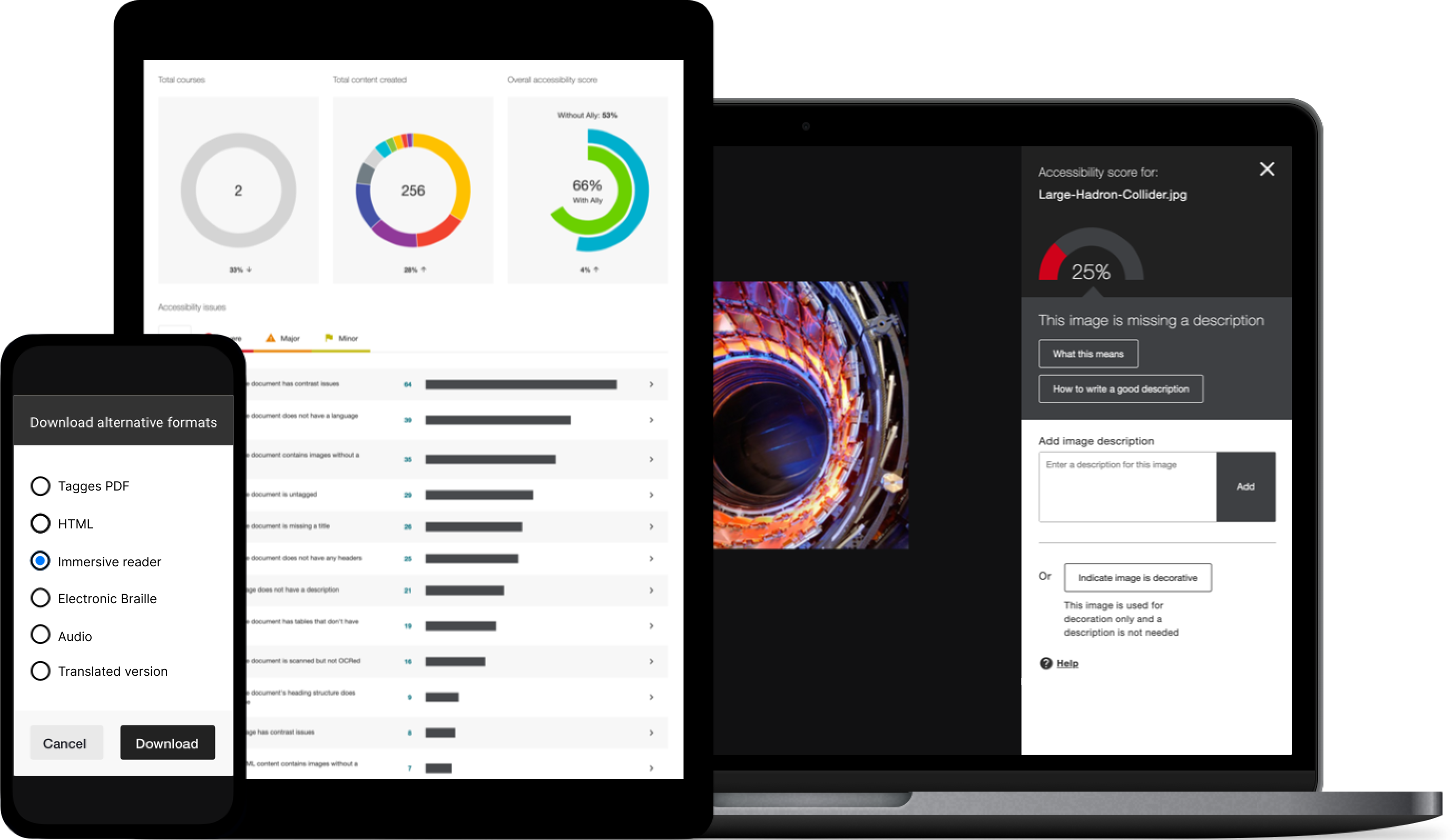Més enllà d’aquestes eines, el Campus Virtual de la Universitat de Barcelona disposa de la funció BBAlly, que ofereix informació del grau d’accessibilitat dels materials que el professorat publica, i alhora permet que l’alumnat es pugui descarregar els documents en diferents formats que cobreixen totes les necessitats educatives individuals (sempre que el docent hagi habilitat l’opció corresponent).