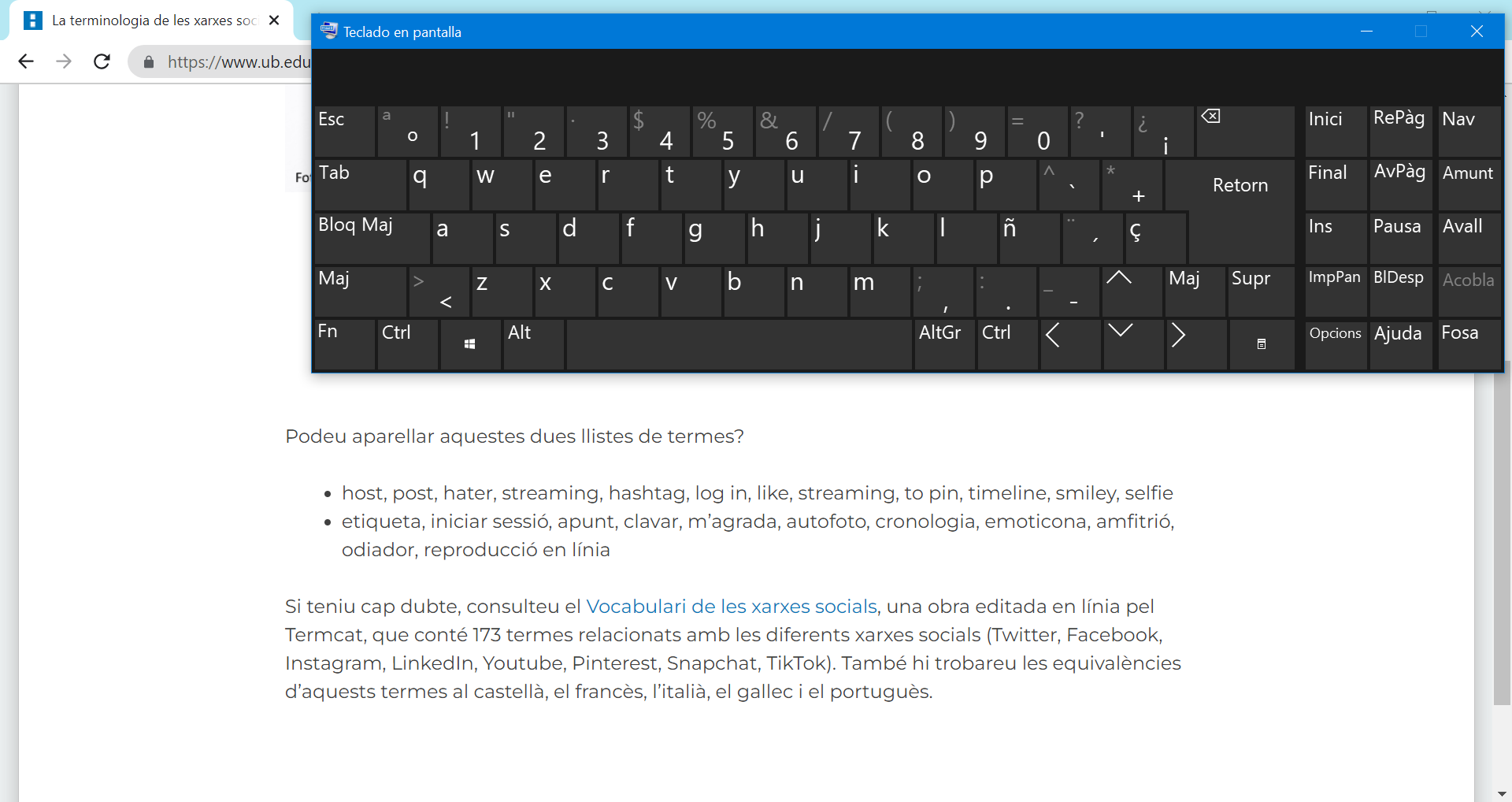 - Hi ha opcions alternatives si no podem fer servir un teclat físic, com ara escriure amb el ratolí al teclat que apareix en pantalla. S’activa per mitjà de la drecera