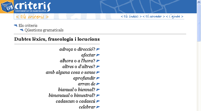 D’altra banda, malgrat que molts usuaris agraïen la versió en format llibre, vam decidir també actualitzar el suport de la informació, i és per això que es va optar per un sistema de bases de dades, consultable pels usuaris via web mitjançant pàgines actualitzades constantment. Per facilitar al màxim les consultes s’hi ha incorporat un cercador i una llista de paraules clau, a més de la navegació conceptual per quatre blocs temàtics. Malgrat això, però, hem tingut en compte també que es poguessin fer impressions acurades de les fitxes en format PDF. El resultat, des del punt de vista tecnològic, és una eina potent i complexa pel que fa a l’arquitectura, però que resulta atractiva visualment, i senzilla pel que fa a la interacció amb l’usuari general.