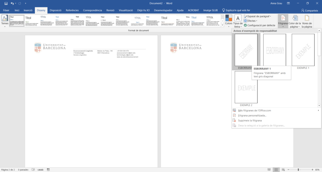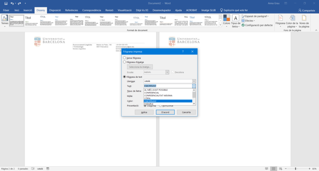 Davant d’aquest problema, la solució, encara que d’entrada no ho sembli, és fàcil. En comptes d’inserir una de les filigranes predeterminades, heu de triar Disseny > Filigrana > Filigrana personalitzada. Definiu les opcions que us interessin, i llestos!