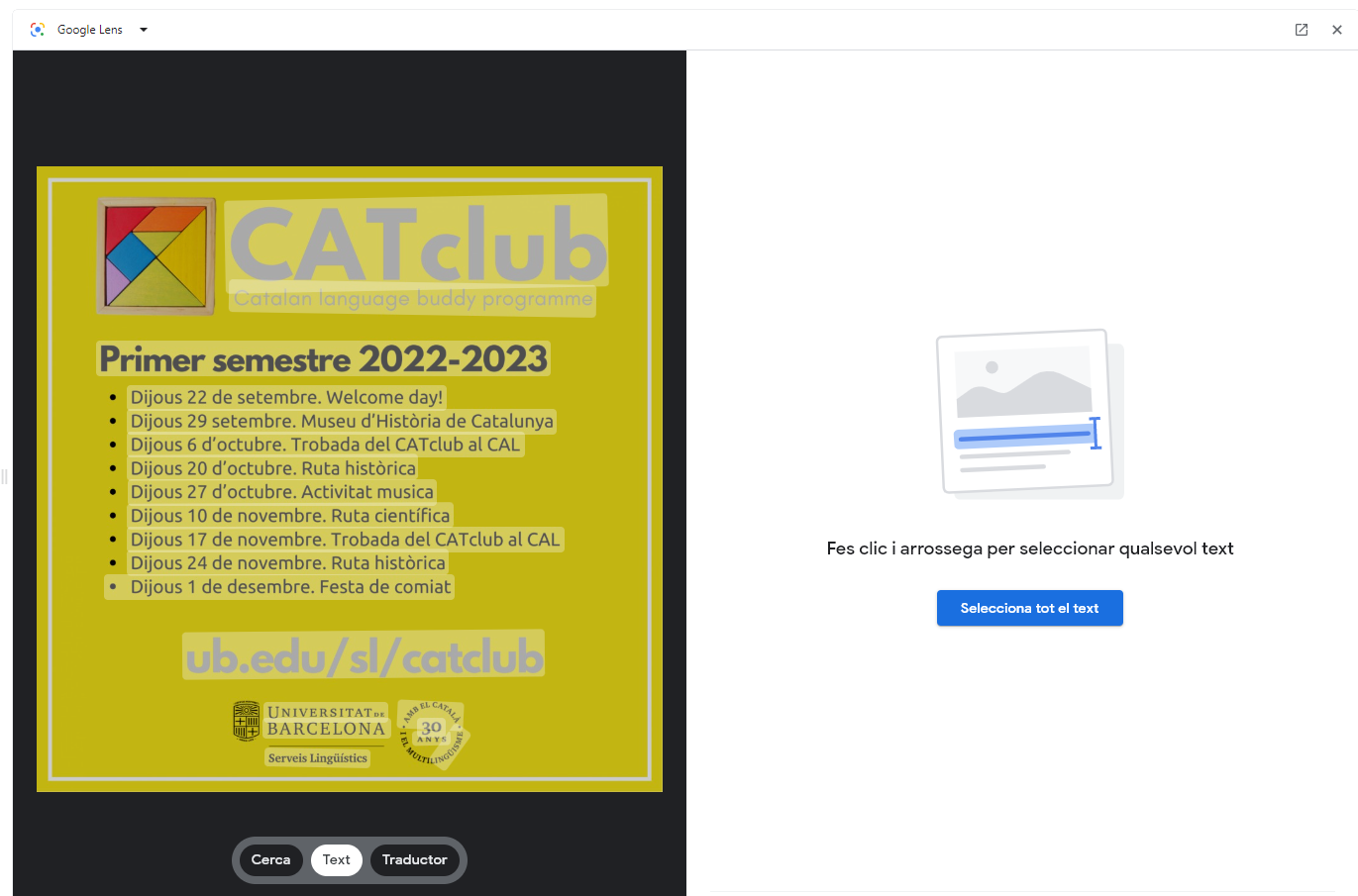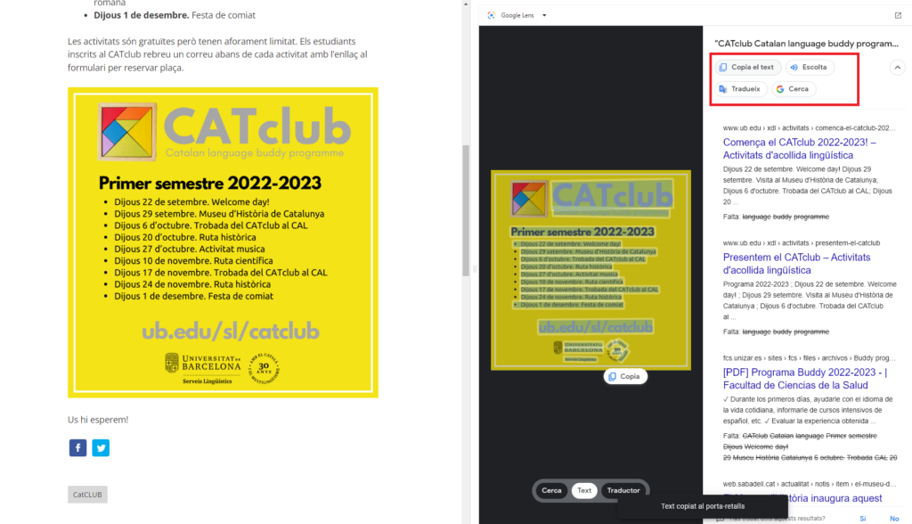 Algunes de les funcions que ofereix són cercar una imatge per trobar-la en mides diferents, veure imatges similars, trobar-ne la font original o saber quins llocs web l’han feta servir. Ara bé, té altres utilitats molt interessants, com ara la detecció i reconeixement del text que apareix a la imatge (cosa que afavoreix l’accessibilitat!). El Lens permet seleccionar-lo, copiar-lo (i enganxar-lo en un document de text, per exemple) i, fins i tot, traduir-lo amb el traductor de Google.
