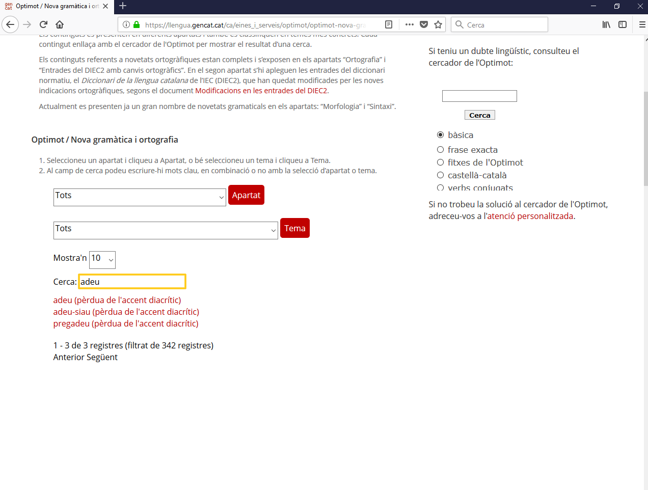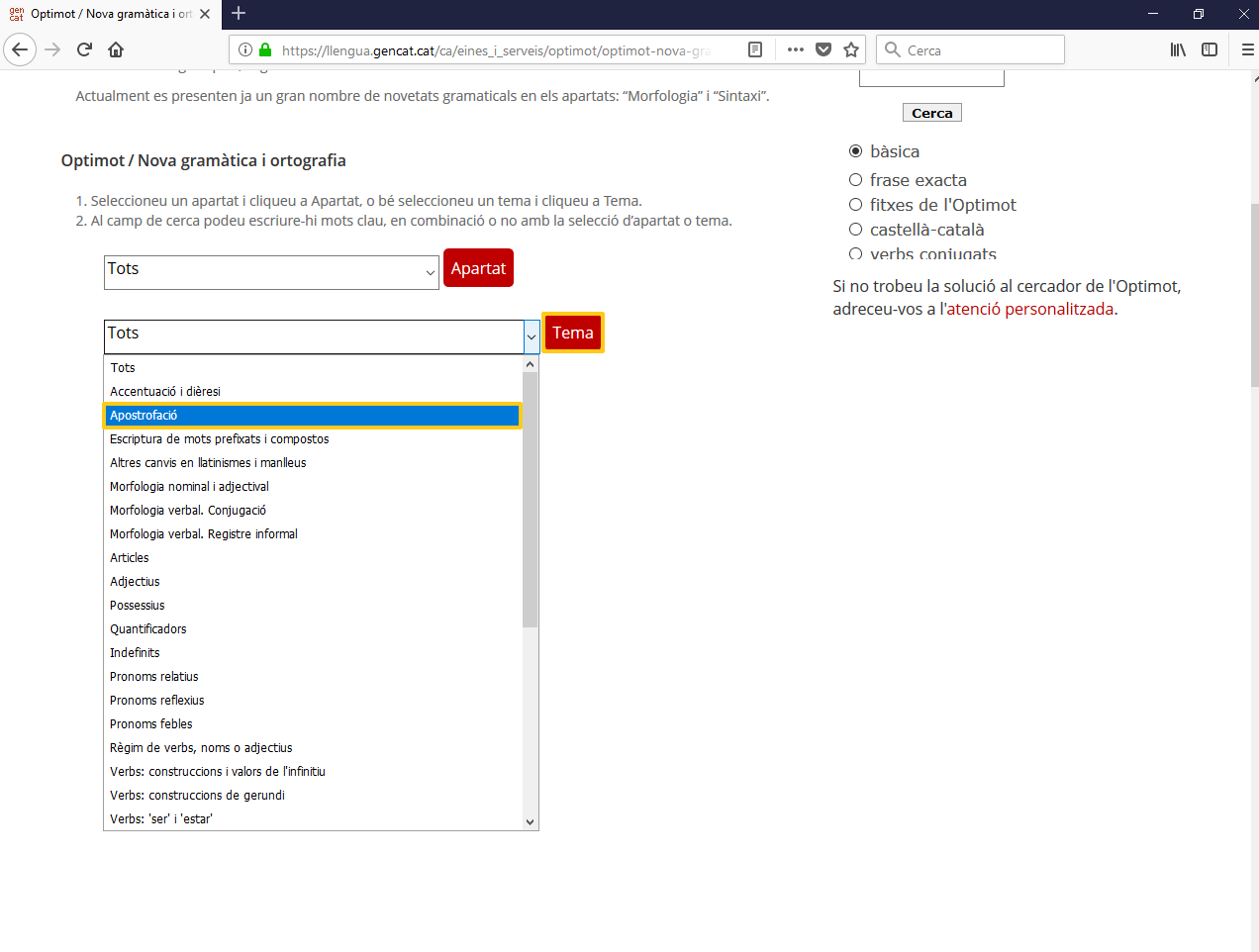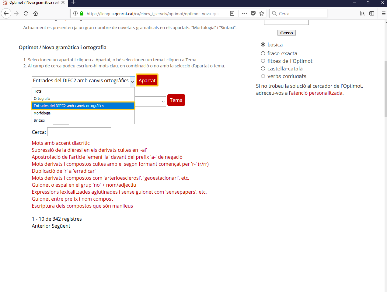 El cercador, més enllà de la cerca lliure per paraules, té una opció per seleccionar apartats («ortografia», «sintaxi», «morfologia» o «entrades del DIEC2 amb canvis ortogràfics») o temes («apostrofació», «accentuació i dièresi» o «escriptura de mots prefixats i compostos», per exemple), i filtrar encara més els resultats de la cerca.