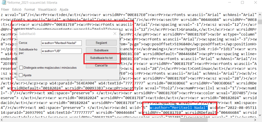 Edició>Cercai cerqueu w:author per trobar el nom dels autors. Aneu aEdició>Substitueixi canvieu el nom dels autors existents pel nom nou. Feu el mateix amb les inicials dels autors, que trobareu cercant w:initials. - Per acabar, torneu a obrir el document amb el Word i deseu-lo amb l’extensió .docx. Veureu que ara al fitxer només hi apareix un sol autor.