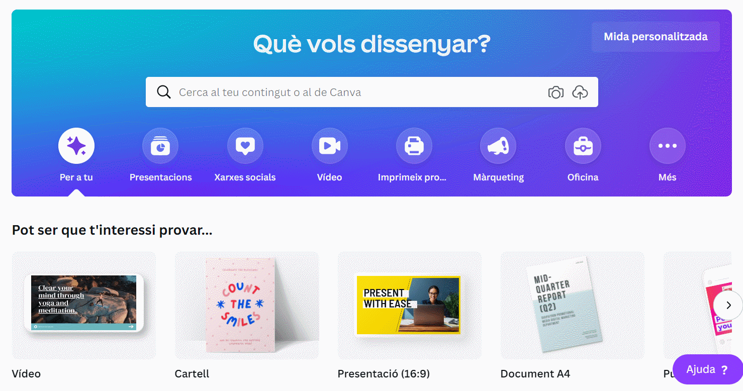 El Canva és un programa d’edició en línia per crear i editar tot de recursos gràfics en línia. El funcionament senzill i intuïtiu de la plataforma i la gran quantitat de models i recursos permeten obtenir resultats bons i ràpids. L’aplicació permet editar vídeos amb la mateixa facilitat amb què es crea un cartell. Es pot fer des d’un vídeo normal (16:9), fins a vídeos per a les històries d’Instagram, TikTok o a altres xarxes socials. L’editor disposa de diverses plantilles predeterminades per muntar vídeos impactants amb poc temps.