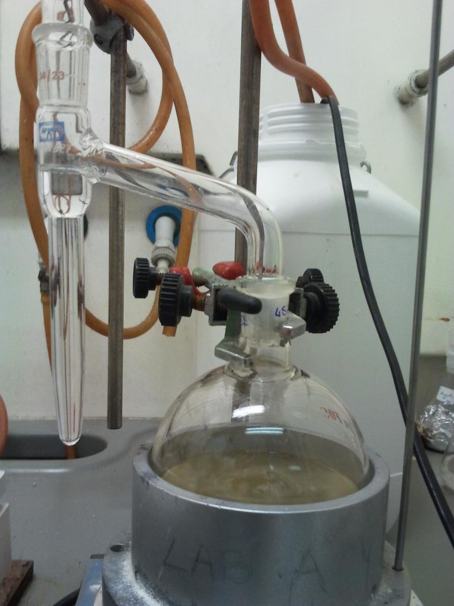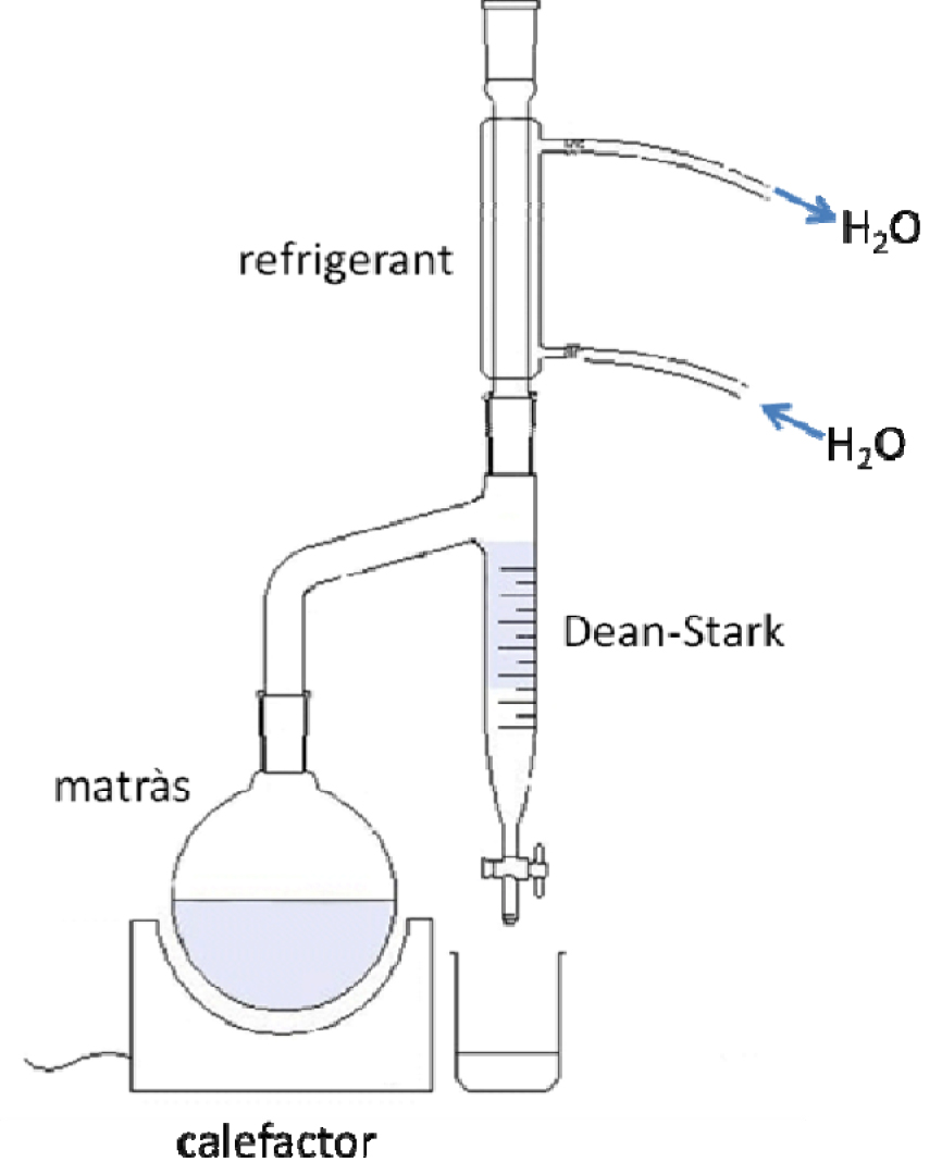 Al laboratori químic, l’aparell Dean-Stark més utilitzat (Fig 3.16) consta d’una peça vertical cilíndrica de vidre, sovint amb graduació volumètrica en tota la seva llargada i amb una aixeta de precisió a la part inferior de manera similar a una bureta. A la part superior del cilindre s’hi acobla la part inferior del condensador de reflux (refrigerant). De la part superior lateral del cilindre surt un braç que s’inclina i acaba en forma vertical per adaptar-se al matràs de reacció. Durant la reacció, els vapors formats pel dissolvent de la reacció i el component a eliminar pugen del matràs de reacció cap al refrigerant i condensen caient en el col·lector Dean-Stark. En aquest, els líquids immiscibles se separen en dues fases o capes. Quan la fase superior (menys densa) assoleix el nivell del braç lateral flueix de tornada cap al matràs de reacció, mentre que la fase inferior resta a la trampa. La trampa arriba a la seva capacitat màxima quan la fase inferior arriba al nivell del braç lateral i a partir d’aquest punt, la fase inferior tornaria a fluir també cap al matràs de reacció. Per tant, és important eliminar part d’aquesta capa a través de l’aixeta de la part inferior de l’aparell Dean-stark tantes vegades com sigui necessari.