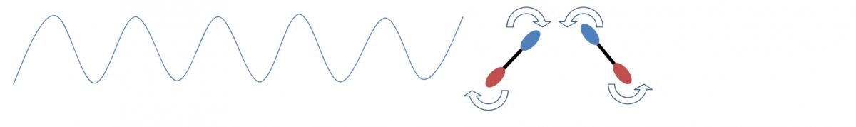 El componente eléctrico de la radiación electromagnética es el responsable del calentamiento mediante dos mecanismos: la rotación dipolar y la conducción iónica. La rotación dipolar es una interacción en que las moléculas polares intentan alinearse sobre sí mismas a medida que el campo eléctrico de la radiación de microondas oscila. Este movimiento rotacional para reorientarse consigue una transferencia de energía por fricción molecular (Fig 3.24). La conducción iónica tiene lugar cuando hay iones o especies iónicas libres en la disolución, que en presencia del campo eléctrico de la radiación intentan orientarse de forma análoga a la rotación dipolar. El resultado es un supercalentamiento localizado de forma instantánea.