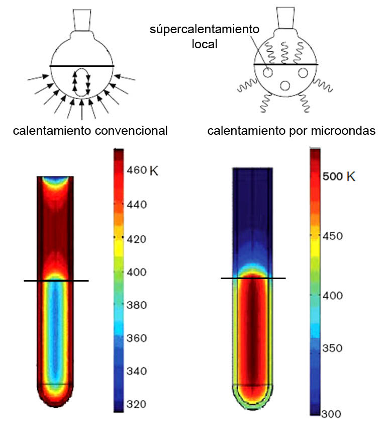 En un proceso de calentamiento tradicional el calor pasa de fuera del recipiente hacia el interior de forma que la temperatura más elevada se encuentra en la zona cercana a las paredes (más cercana a la fuente de calor) y se va difundiendo hacia la disolución y los reactivos.