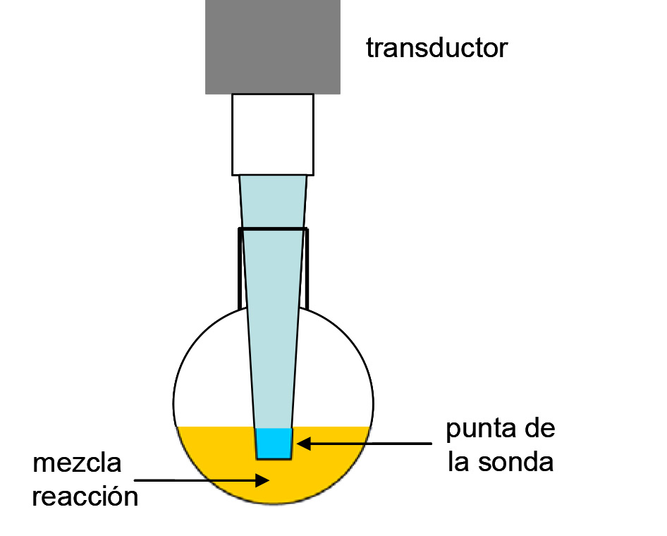 La utilización de sondas ultrasónicas permite introducir la energía acústica directamente en el interior de la mezcla de reacción en lugar de depender de su transferencia a través del agua del baño de ultrasonidos y de las paredes del matraz, con lo cual se puede aumentar la cantidad de potencia ultrasónica disponible para la reacción (Fig 3.31). El método más sencillo consiste en introducir la punta con vibración ultrasónica de la sonda en la mezcla de reacción. Las sondas ultrasónicas usan frecuencias alrededor de los 20 kHz. La principal ventaja de la utilización de sondas ultrasónicas es que la potencia ultrasónica transmitida a la reacción es controlable, pudiendo llegar hasta unos cuantos centenares de W × cm−2.