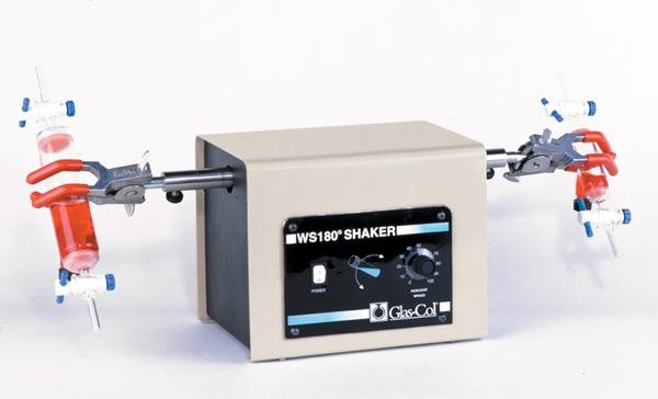 Existen diferentes tipos de sistemas de agitación mecánica: agitadores de palas, orbitales, oscilantes, rotativos, vibradores, etc. Unos de los tipos de agitador mecánico utilizado en los laboratorios químicos, es el orbitálico (Fig 3.3) y el llamado “wrist-shaker”. Su finalidad es la mezcla automatizada de sistemas heterogéneos. Se trata de un motor con una barra metálica acoplada que trae incorporadas ocho pinzas para la sujeción de ocho matraces o erlenmeyers respectivamente. No todas las posiciones tienen que estar ocupadas, pero el sistema tiene que estar equilibrado en su peso (Fig 3.4 y 3.5).