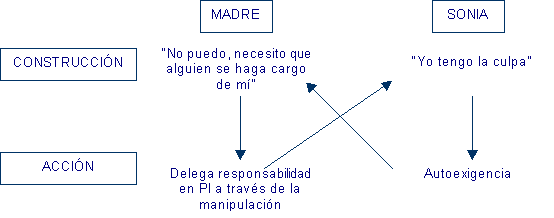 La cliente anticipa que haga lo que haga va a fracasar. Esta construcción esta basada en experiencias en las que los demás, especialmente su padre, la han visto como un fracaso Nunca serás nada en la vida. La implicación en esta anticipación tiene que ver no sólo con sus construcciones sino también con las construcciones que otras personas tienen de ella. Cuando se encuentra con el acontecimiento confirma su anticipación de fracaso porque descubre que no es un número uno. Su nivel de expectativas es tan alto que le resulta inalcanzable, el pensamiento es muy polarizado en términos de todo o nada. Esto la lleva a confirmar su hipótesis inicial, lo que impide realizar una revisión constructiva del sistema. Da la impresión de que Sonia busca situaciones que le confirmen esta anticipación. En las situaciones en las que no confirma esta construcción (ej. una vez que su estilo de trabajo fue puesto como modelo para todo su grupo de trabajo porque resultó ser más eficaz que el de sus compañeras) aparece un gran sentimiento de ansiedad, que desde este modelo se entiende como la toma de conciencia de que los acontecimientos con los que se enfrenta quedan fuera del ámbito de conveniencia de su SCP. El éxito es un área de experiencia que no tiene construida y eso le provoca ansiedad (Botella y Feixas, 1991). Otro sentimiento que aparece con frecuencia es la culpa, que desde este modelo es la toma de conciencia de que el self queda fuera de la propia estructura nuclear. Sonia se construye a sí misma como buena persona y la culpa aparece cuando ella siente que no se está comportando como se comportaría una buena persona, ej. cuando se enfada con alguien, cuando siente rabia, etc. y entonces aparece la necesidad de castigarse (vómitos). . Hipótesis circular sistémicaSi tomamos el modelo de Linares (1996) sobre parentalidad y conyugalidad, en la familia de Sonia la conyugalidad está deteriorada desde hace años antes de que yo naciera y también la parentalidad en lo que se refiere a aspectos de nutrición emocional, función que ha cumplido la abuela paterna mi abuela me ha hecho de madre, es una de las personas a las que más quiero. Los aspectos de socialización los ha representado el padre (funciones normativas, exigencia): La exigencia como condición de reconocimiento es una constante en la historia de los depresivos. Se produce sin imposiciones brutalmente explícitas, con sutiles presiones indirectas y chantajes emocionales" (Linares, 1996, pág. 96). Sonia está inmersa en un conflicto de lealtades. Cuando le salen las cosas bien traiciona a los demás y cuando le salen mal se traiciona a sí misma.