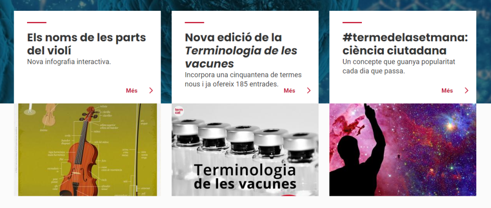 Immediatament a sota s’ofereix un accés directe a tres continguts terminològics destacats, generalment relacionats amb l’actualitat informativa, amb nous materials o notícies d’interès.