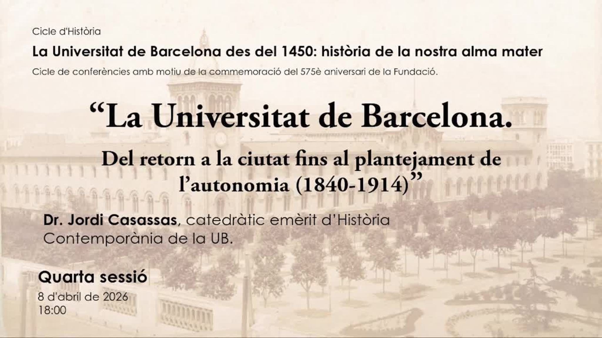 La Universitat de Barcelona. Del retorn a la ciutat fins al plantejament de l'autonomia (1840-1914) 8 Abril, 2026