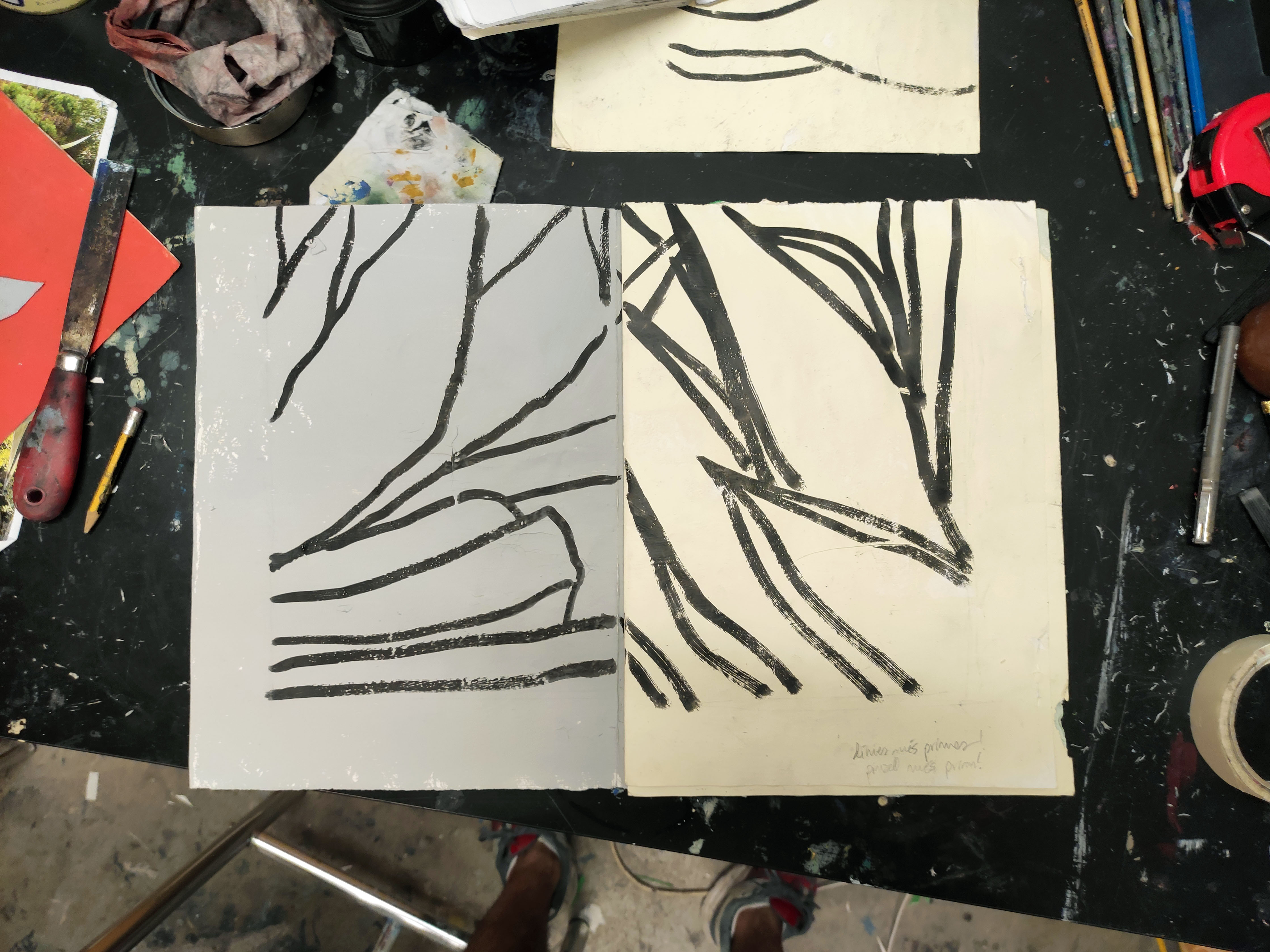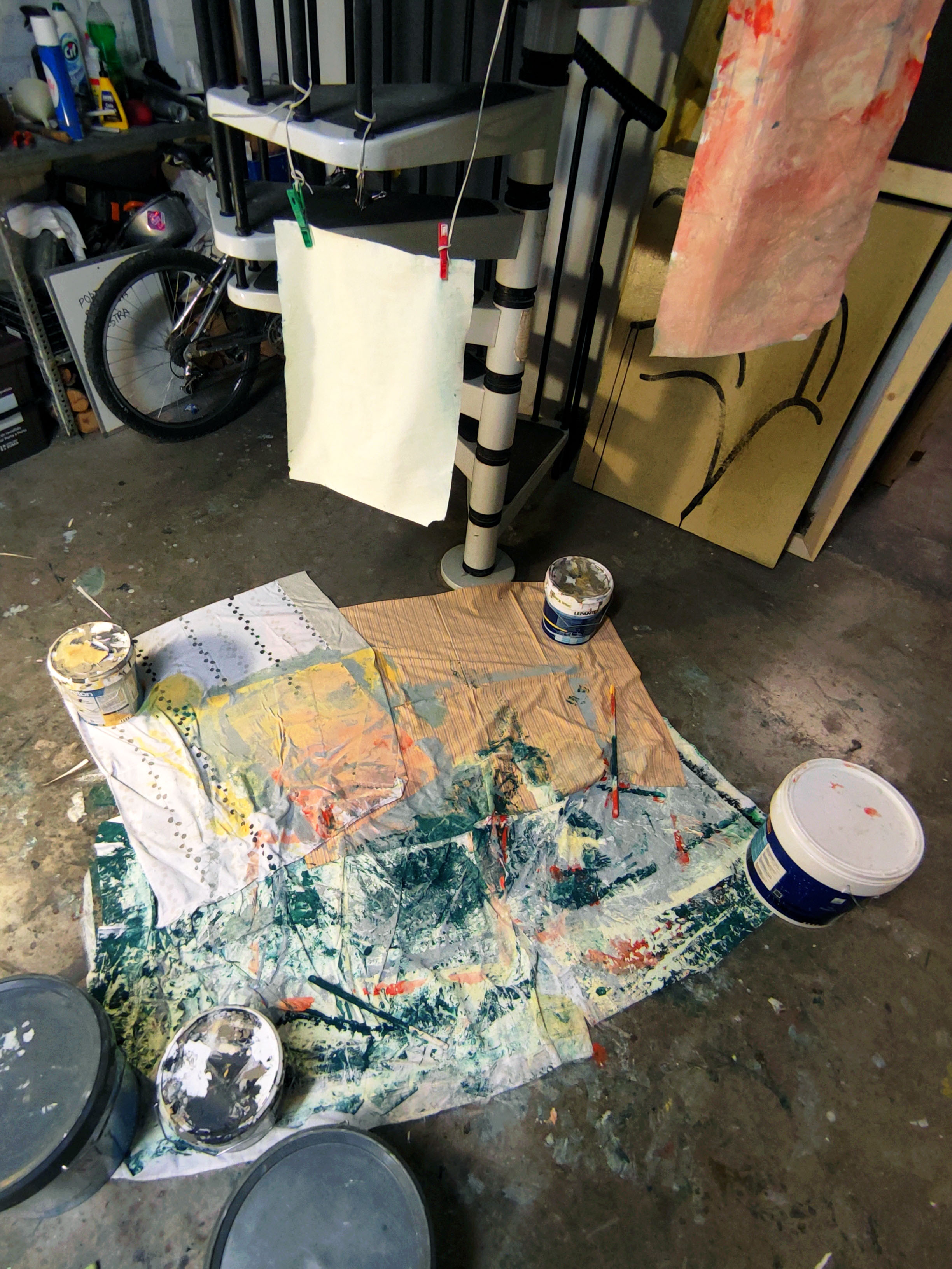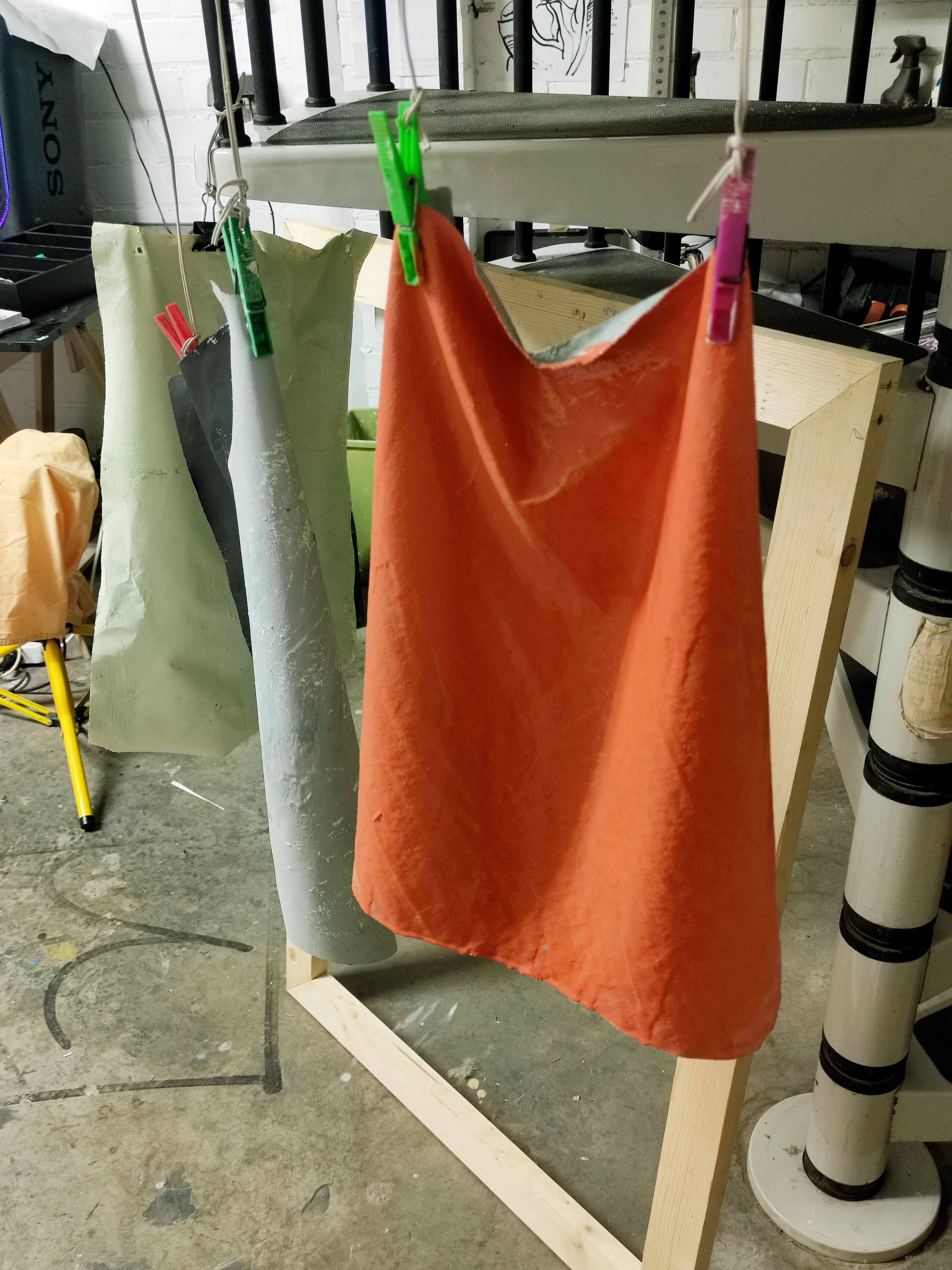 Robant-li la idea a Gerhard Richter, emprimo les teles que utilitzo per a la pintura a l’oli amb pintura plàstica. La de parets. Aquest cop l’uso per donar una nova textura al paper, una que aquest mai podria tindre. En aquestes imatges mostro el procés d’assecatge de les bases del llibre. La majoria en paper cobert de pintura plàstica, la taronja en concret és tela i la carmí està pintada amb esmalt. Totes menys la verda són d’uns 50 x 35 cm, aquesta darrera és un 100 x 70.