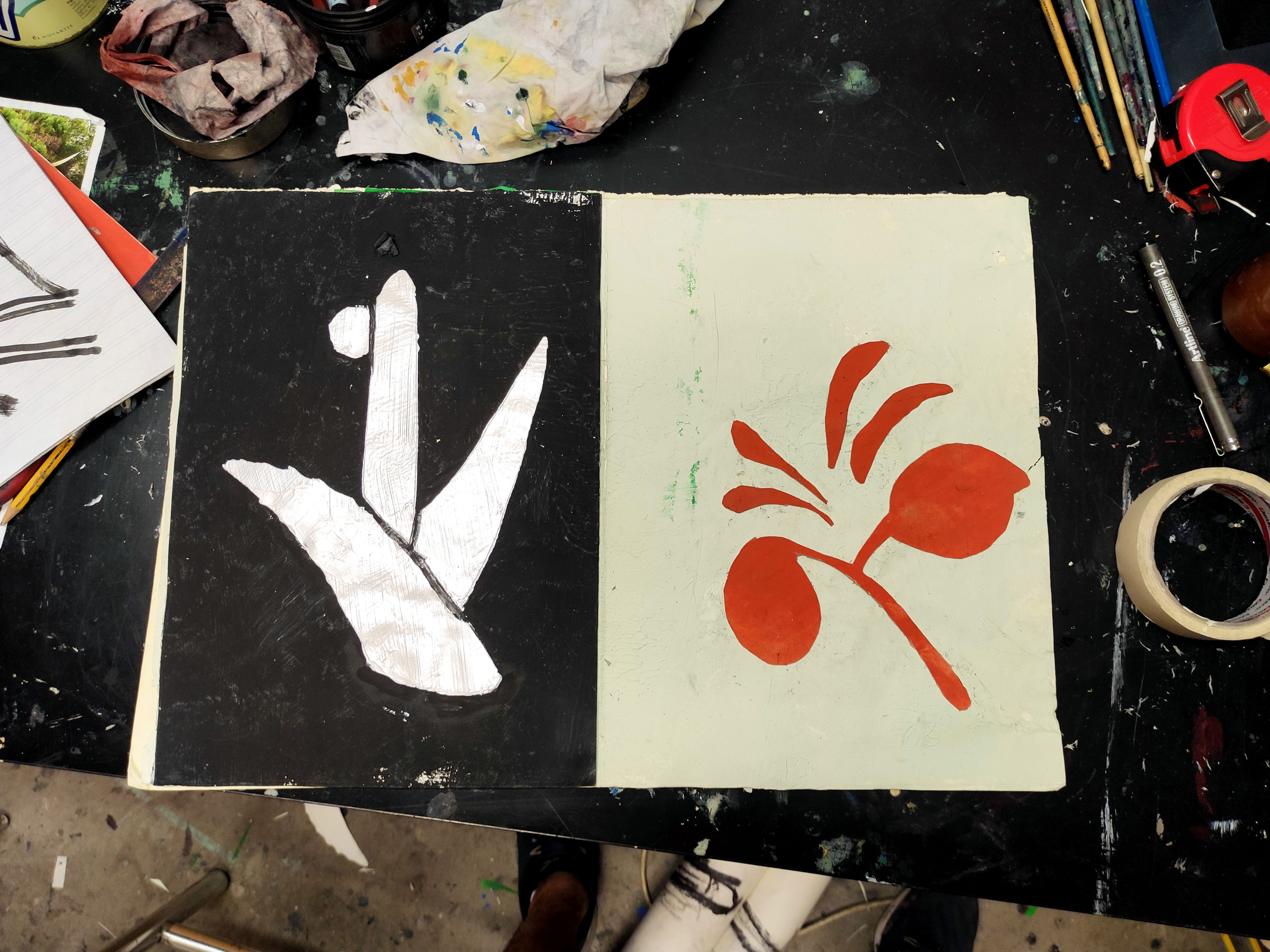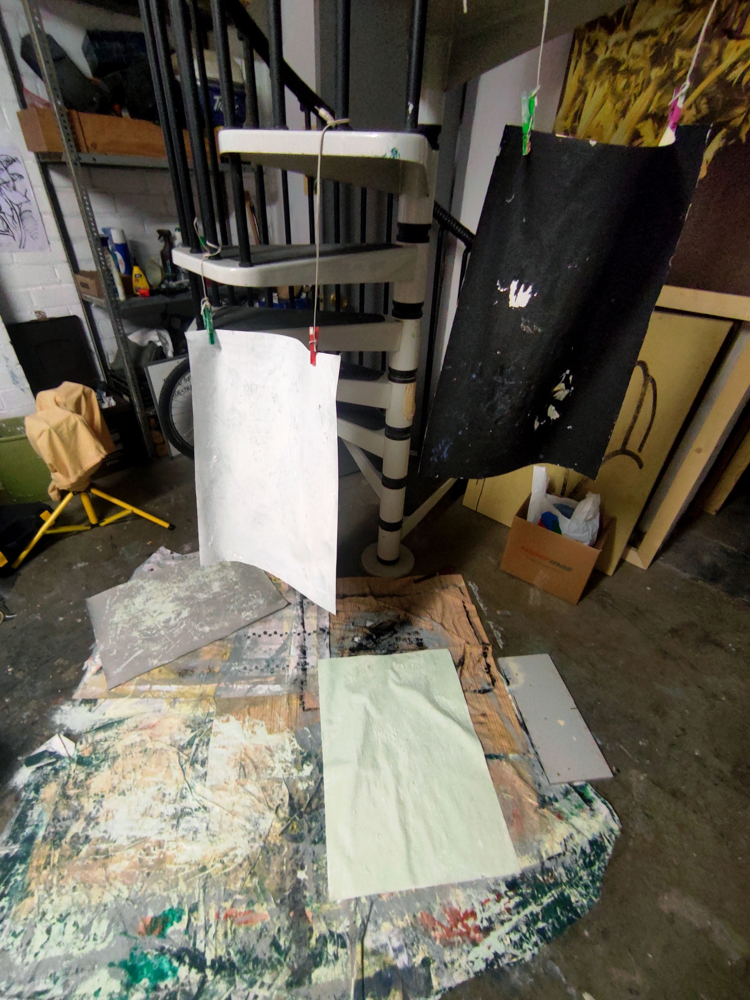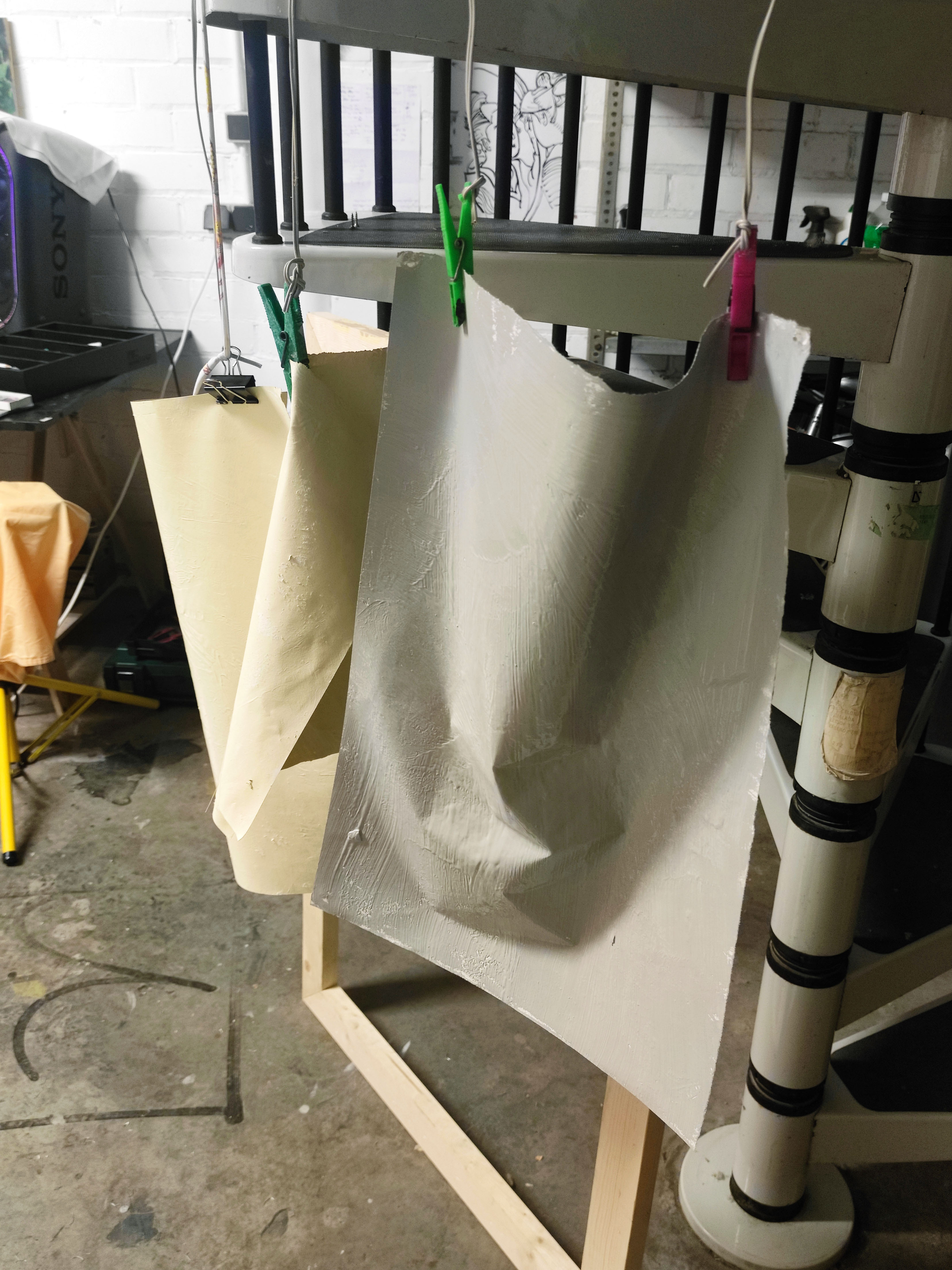 Robant-li la idea a Gerhard Richter, emprimo les teles que utilitzo per a la pintura a l’oli amb pintura plàstica. La de parets. Aquest cop l’uso per donar una nova textura al paper, una que aquest mai podria tindre. En aquestes imatges mostro el procés d’assecatge de les bases del llibre. La majoria en paper cobert de pintura plàstica, la taronja en concret és tela i la carmí està pintada amb esmalt. Totes menys la verda són d’uns 50 x 35 cm, aquesta darrera és un 100 x 70.
