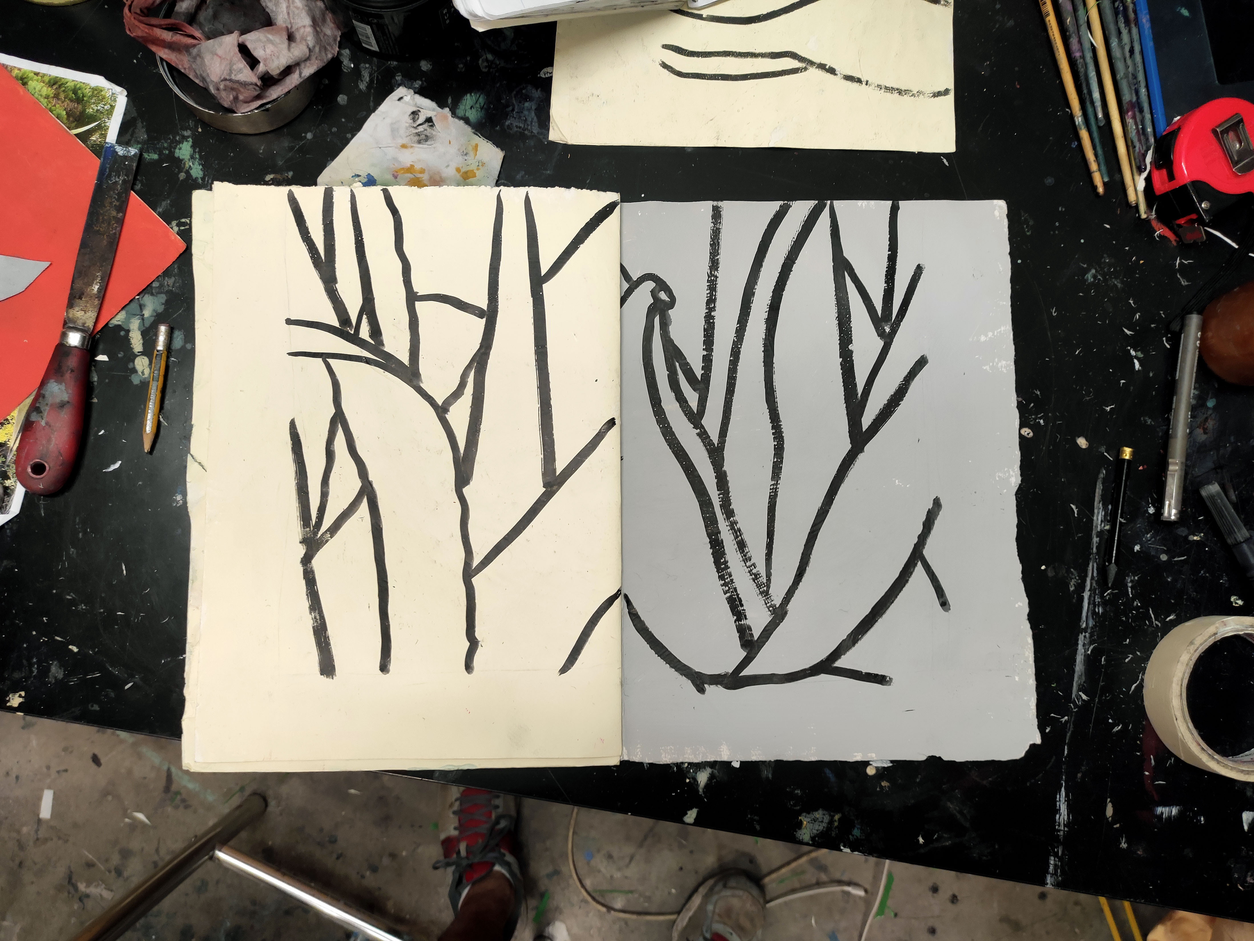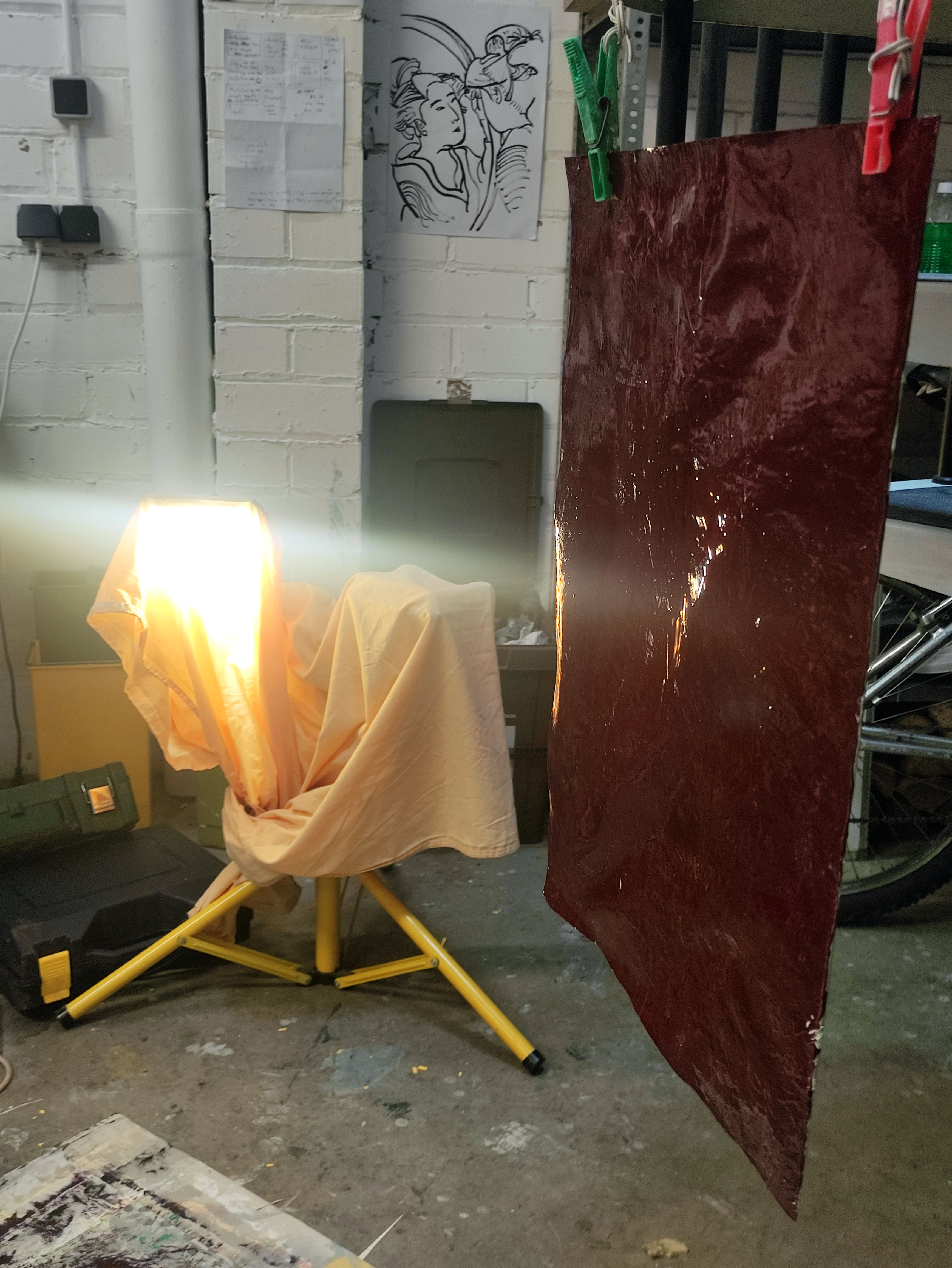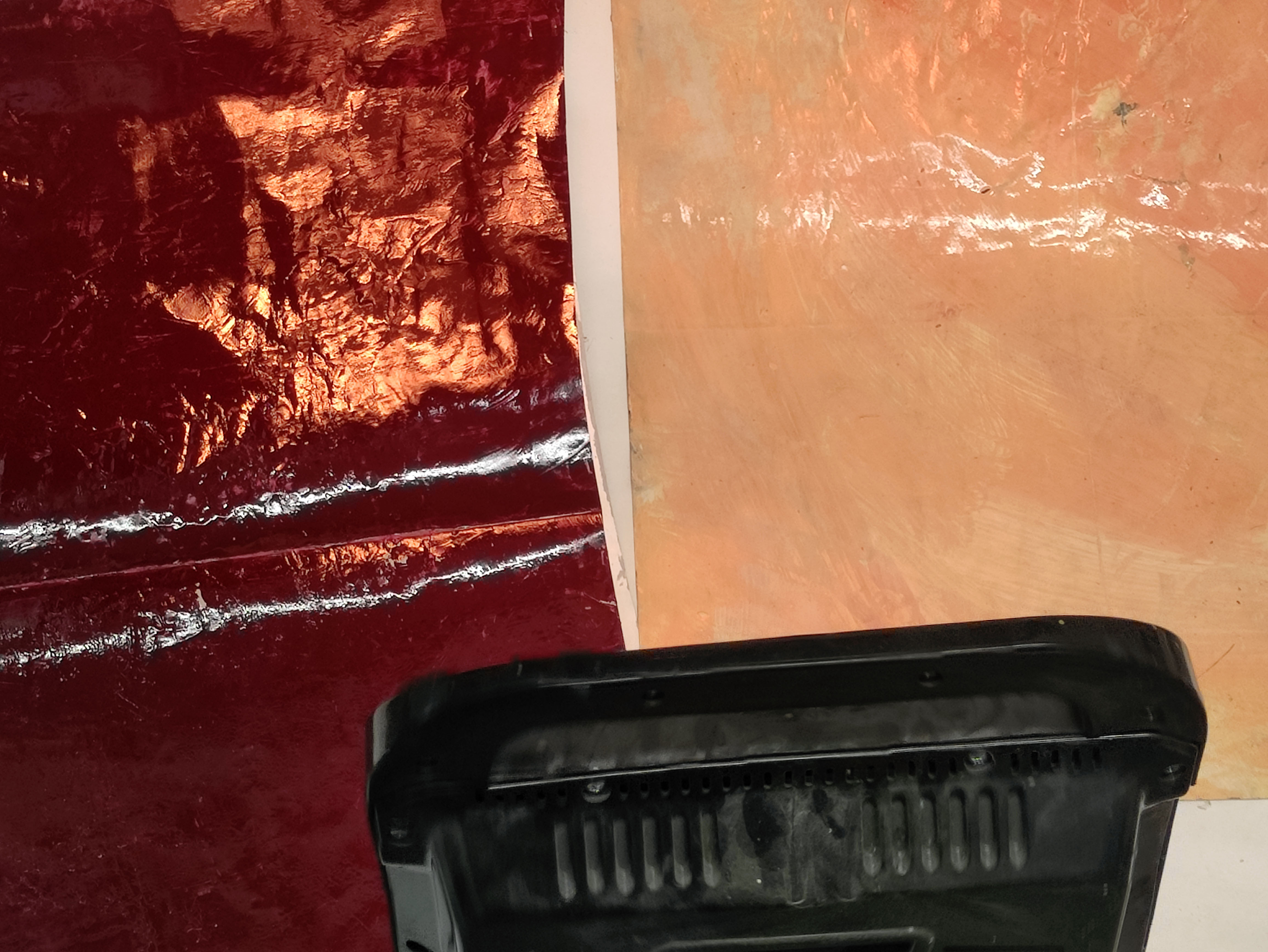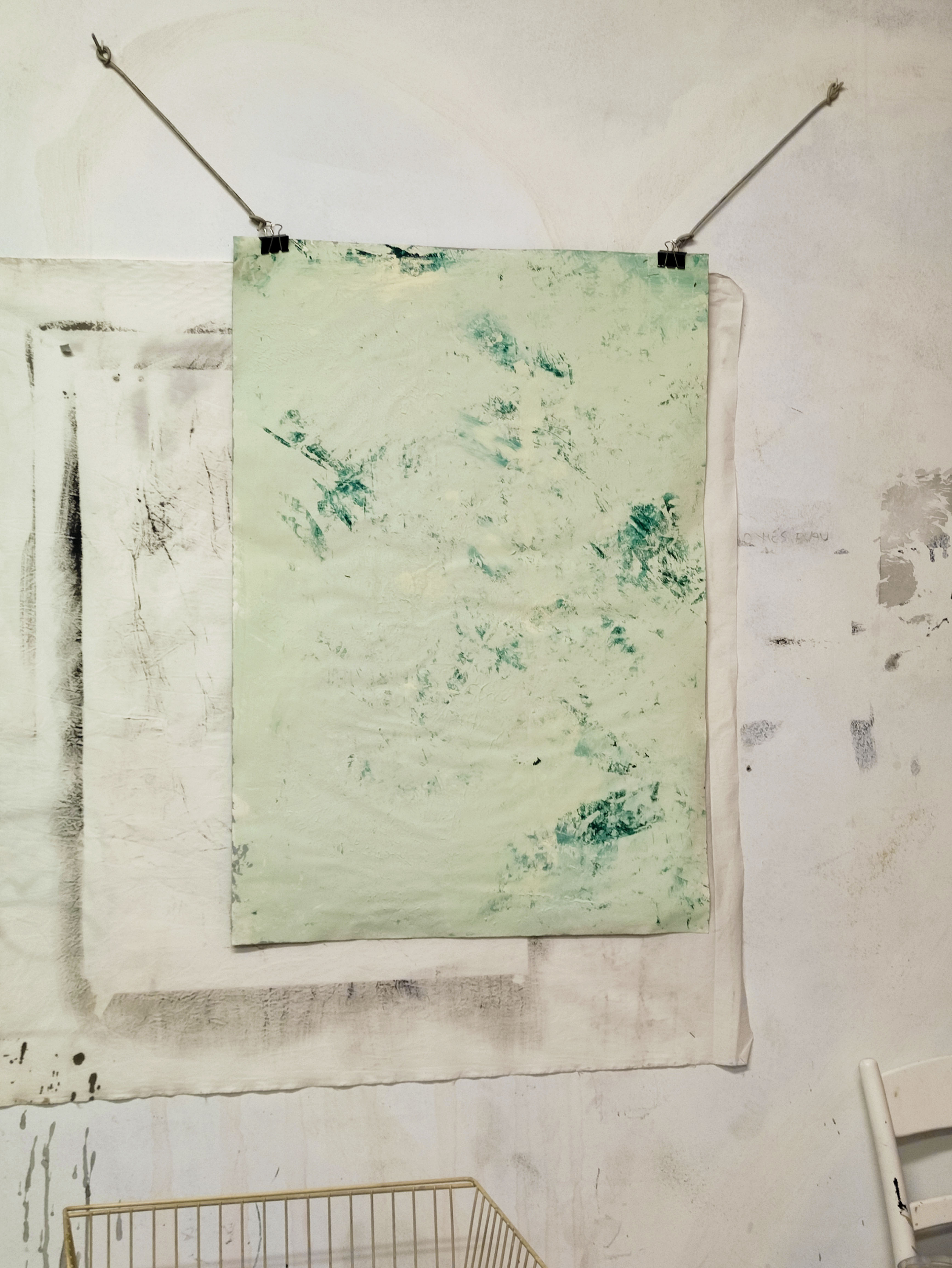 Robant-li la idea a Gerhard Richter, emprimo les teles que utilitzo per a la pintura a l’oli amb pintura plàstica. La de parets. Aquest cop l’uso per donar una nova textura al paper, una que aquest mai podria tindre. En aquestes imatges mostro el procés d’assecatge de les bases del llibre. La majoria en paper cobert de pintura plàstica, la taronja en concret és tela i la carmí està pintada amb esmalt. Totes menys la verda són d’uns 50 x 35 cm, aquesta darrera és un 100 x 70.