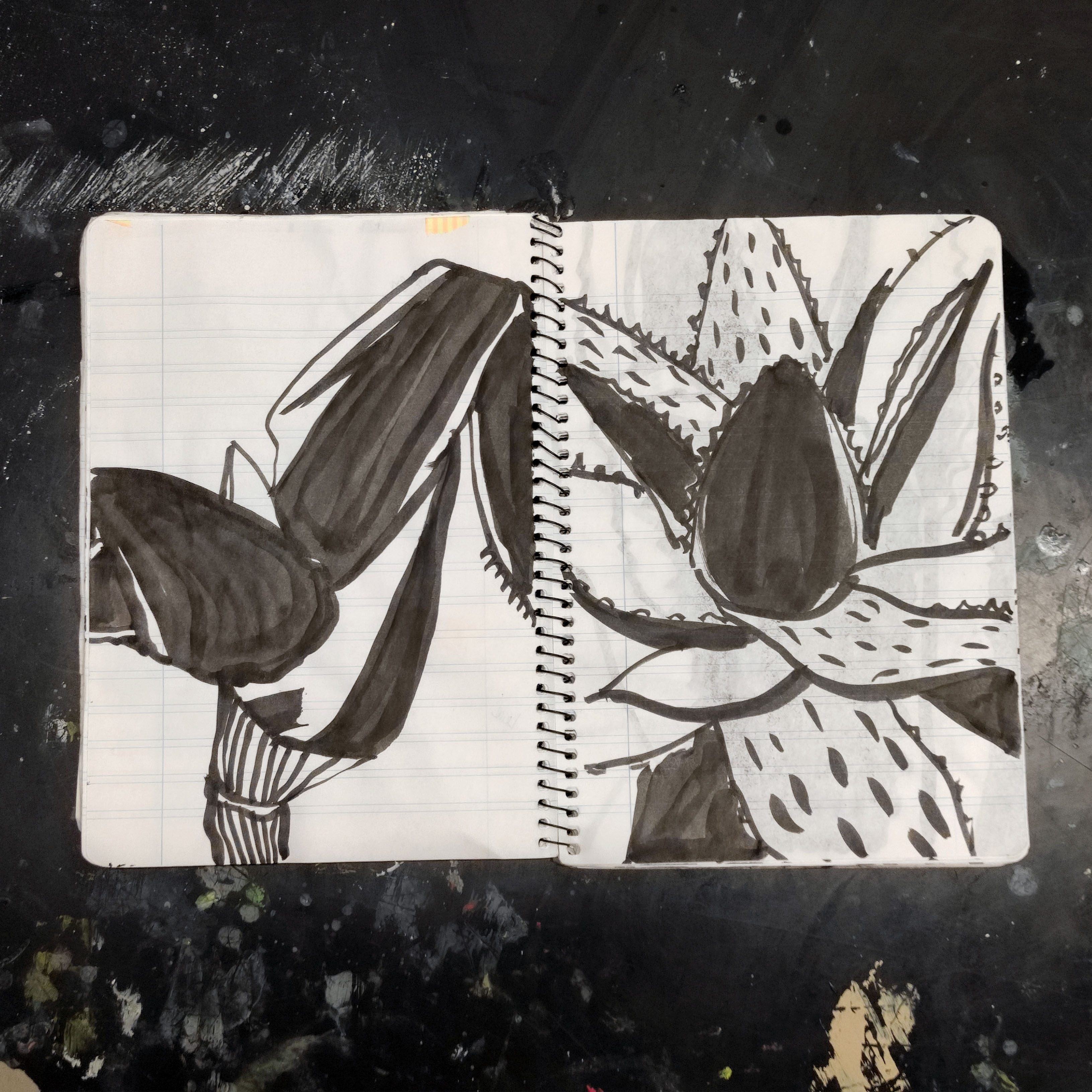 Pulsar combina els dibuixos de plantes que casualment acumulo a les meves llibretes amb les bases que preparo per als quadres a l’oli en una llibreta experimental que juga tant amb el color i la forma, com amb la textura. La icònica atzavara té el seu paper en el projecte com és habitual amb els meus treballs.